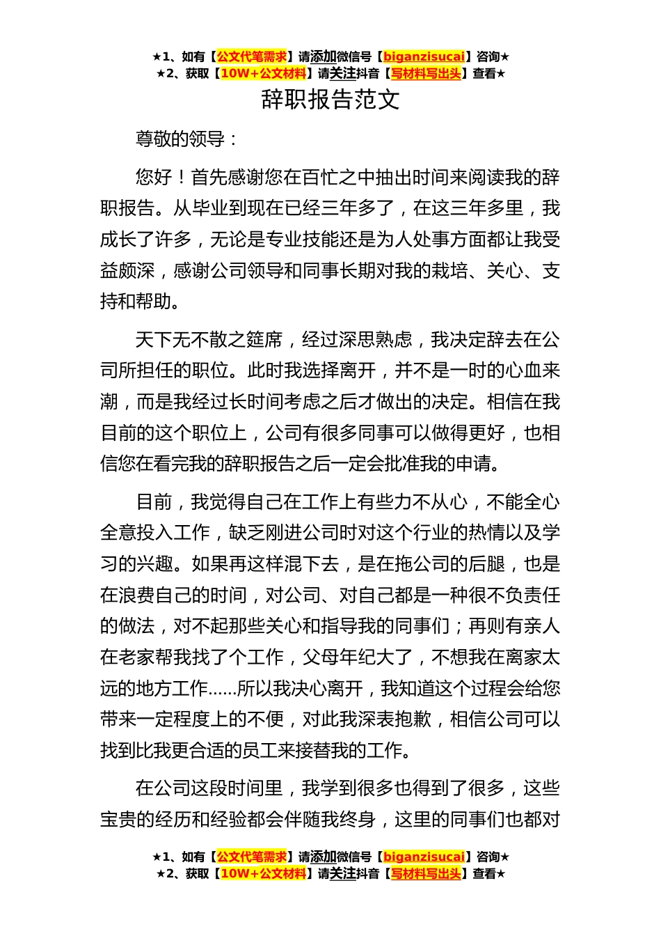 ★1、如有【公文代笔需求】请添加微信号【biganzisucai】咨询★★2、获取【10W+公文材料】请关注抖音【写材料写出头】查看★★1、如有【公文代笔需求】请添加微信号【biganzisucai】咨询★★2、获取【10W+公文材料】请关注抖音【写材料写出头】查看★★1、如有【公文代笔需求】请添加微信号【biganzisucai】咨询★★2、获取【10W+公文材料】请关注抖音【写材料写出头】查看★辞职报告范文尊敬的领导:您好!首先感谢您在百忙之中抽出时间来阅读我的辞职报告。从毕业到现在已经三年多了,在这三年多里,我成长了许多,无论是专业技能还是为人处事方面都让我受益颇深,感谢公司领导和同事长期对我的栽培、关心、支持和帮助。天下无不散之筵席,经过深思熟虑,我决定辞去在公司所担任的职位。此时我选择离开,并不是...