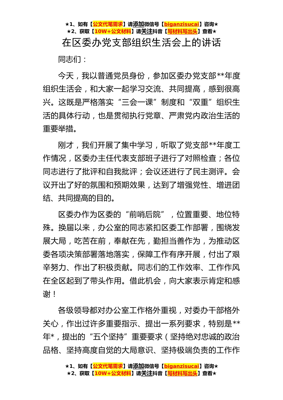 ★1、如有【公文代笔需求】请添加微信号【biganzisucai】咨询★★2、获取【10W+公文材料】请关注抖音【写材料写出头】查看★★1、如有【公文代笔需求】请添加微信号【biganzisucai】咨询★★2、获取【10W+公文材料】请关注抖音【写材料写出头】查看★★1、如有【公文代笔需求】请添加微信号【biganzisucai】咨询★★2、获取【10W+公文材料】请关注抖音【写材料写出头】查看★在区委办党支部组织生活会上的讲话同志们:今天,我以普通党员身份,参加区委办党支部**年度组织生活会,和大家一起学习交流、共同提高,感到很高兴。这既是严格落实“三会一课”制度和“双重”组织生活的具体行动,也是贯彻执行党章、严肃党内政治生活的重要举措。刚才,我们开展了集中学习,听取了党支部**年度工作情况,区委办主任代表...