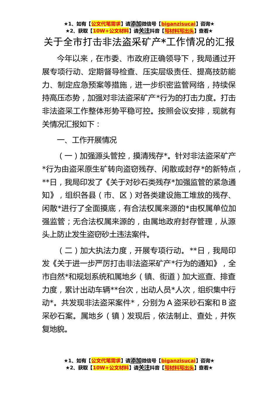 ★1、如有【公文代笔需求】请添加微信号【biganzisucai】咨询★★2、获取【10W+公文材料】请关注抖音【写材料写出头】查看★★1、如有【公文代笔需求】请添加微信号【biganzisucai】咨询★★2、获取【10W+公文材料】请关注抖音【写材料写出头】查看★★1、如有【公文代笔需求】请添加微信号【biganzisucai】咨询★★2、获取【10W+公文材料】请关注抖音【写材料写出头】查看★关于全市打击非法盗采矿产*工作情况的汇报今年以来,在市委、市政府正确领导下,我局通过开展专项行动、定期督导检查、压实层级责任、提高技防能力、制定应急预案等措施,进一步织密监管网络,持续保持高压态势,加强对非法盗采矿产*行为的打击力度。打击非法盗采工作整体形势平稳可控。按照会议安排,现就有关情况汇报如下:一、工作开展...