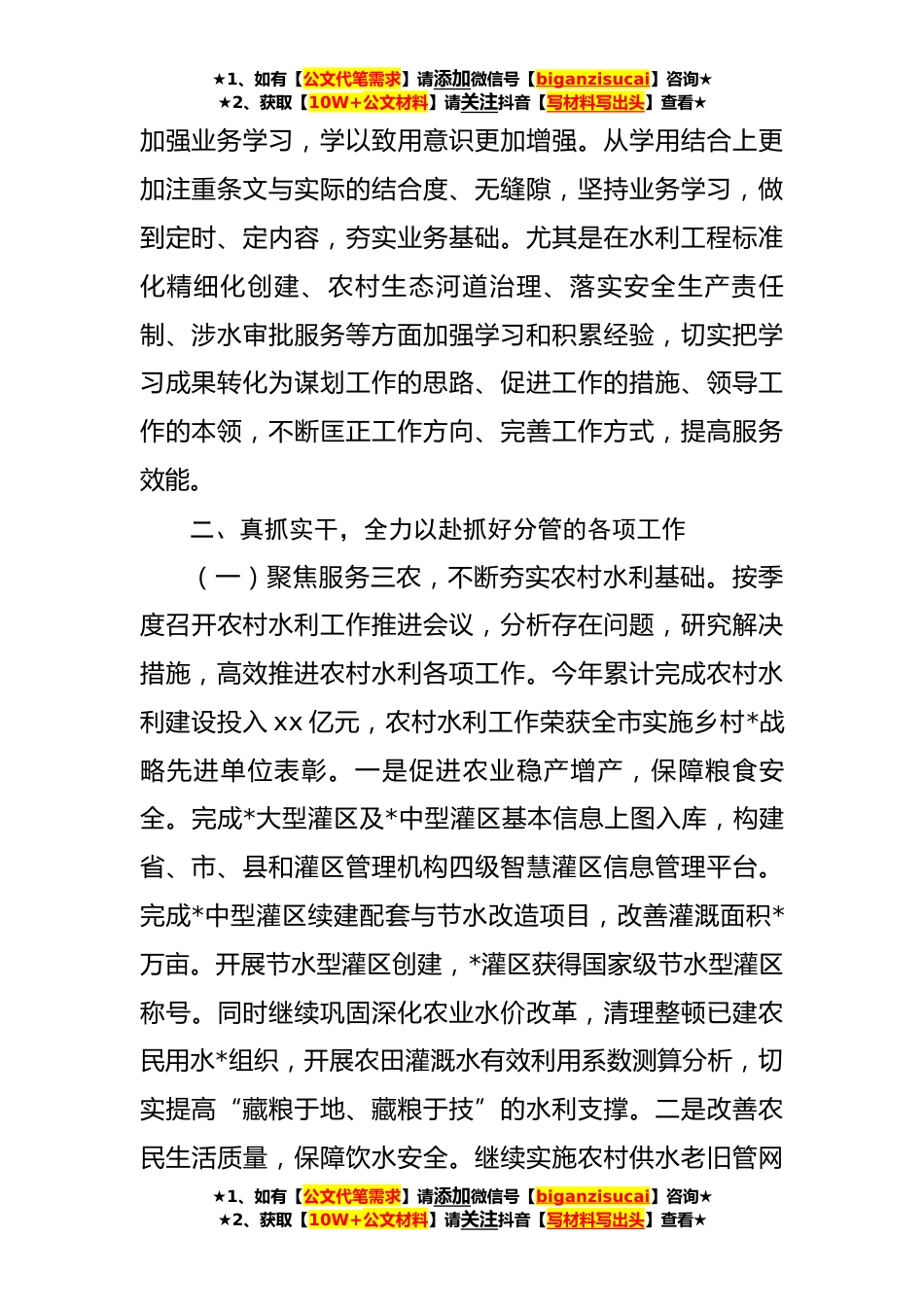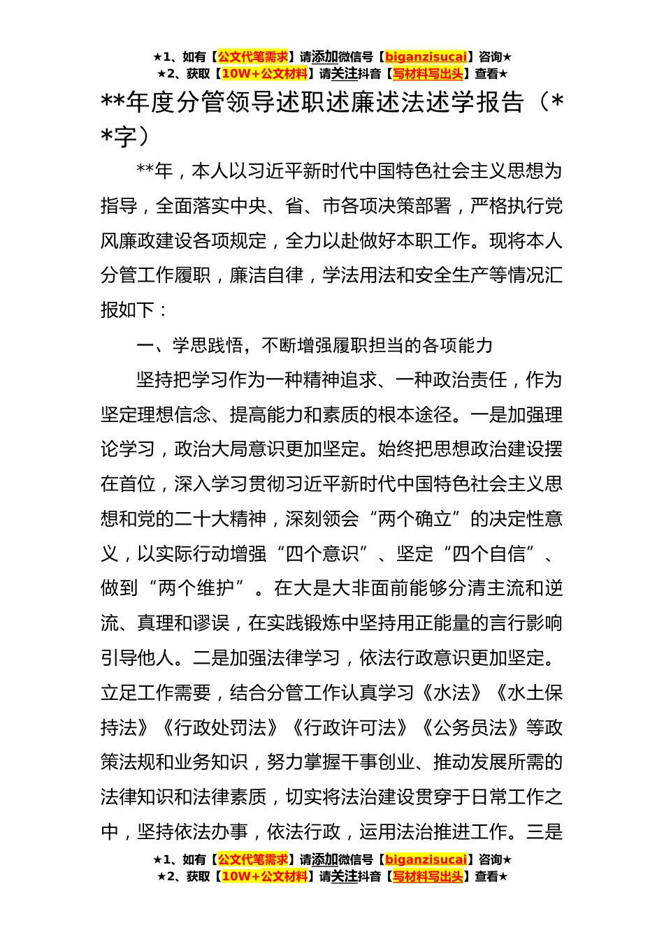 ★1、如有【公文代笔需求】请添加微信号【biganzisucai】咨询★★2、获取【10W+公文材料】请关注抖音【写材料写出头】查看★**年度分管领导述职述廉述法述学报告(**字)**年,本人以习近平新时代中国特色社会主义思想为指导,全面落实中央、省、市各项决策部署,严格执行党风廉政建设各项规定,全力以赴做好本职工作。现将本人分管工作履职,廉洁自律,学法用法和安全生产等情况汇报如下:一、学思践悟,不断增强履职担当的各项能力坚持把学习作为一种精神追求、一种政治责任,作为坚定理想信念、提高能力和素质的根本途径。一是加强理论学习,政治大局意识更加坚定。始终把思想政治建设摆在首位,深入学习贯彻习近平新时代中国特色社会主义思想和党的二十大精神,深刻领会“两个确立”的决定性意义,以实际行动...