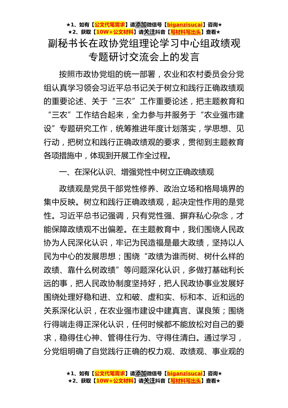 ★1、如有【公文代笔需求】请添加微信号【biganzisucai】咨询★★2、获取【10W+公文材料】请关注抖音【写材料写出头】查看★★1、如有【公文代笔需求】请添加微信号【biganzisucai】咨询★★2、获取【10W+公文材料】请关注抖音【写材料写出头】查看★★1、如有【公文代笔需求】请添加微信号【biganzisucai】咨询★★2、获取【10W+公文材料】请关注抖音【写材料写出头】查看★副秘书长在政协党组理论学习中心组政绩观专题研讨交流会上的发言按照市政协党组的统一部署,农业和农村委员会分党组认真学习领会习近平总书记关于树立和践行正确政绩观的重要论述、关于“三农”工作重要论述,把主题教育和“三农”工作结合起来,全力参与并服务于“农业强市建设”专题研究工作,统筹推进年度计划落实,学思想、见行动,把...