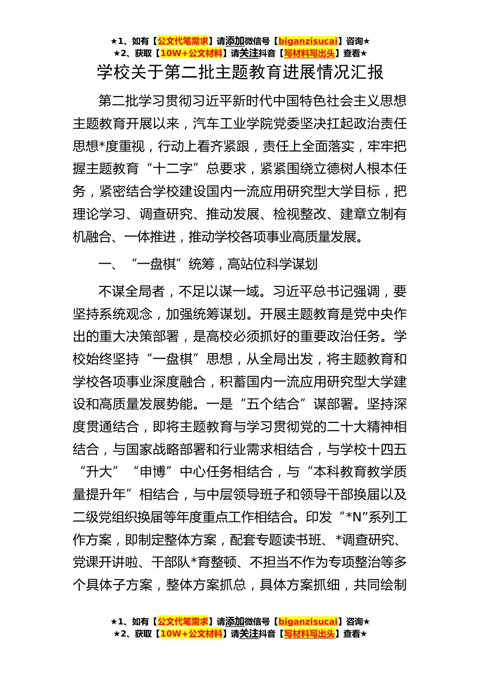 ★1、如有【公文代笔需求】请添加微信号【biganzisucai】咨询★★2、获取【10W+公文材料】请关注抖音【写材料写出头】查看★★1、如有【公文代笔需求】请添加微信号【biganzisucai】咨询★★2、获取【10W+公文材料】请关注抖音【写材料写出头】查看★★1、如有【公文代笔需求】请添加微信号【biganzisucai】咨询★★2、获取【10W+公文材料】请关注抖音【写材料写出头】查看★学校关于第二批主题教育进展情况汇报第二批学习贯彻习近平新时代中国特色社会主义思想主题教育开展以来,汽车工业学院党委坚决扛起政治责任思想*度重视,行动上看齐紧跟,责任上全面落实,牢牢把握主题教育“十二字”总要求,紧紧围绕立德树人根本任务,紧密结合学校建设国内一流应用研究型大学目标,把理论学习、调查研究、推动发展、检视...