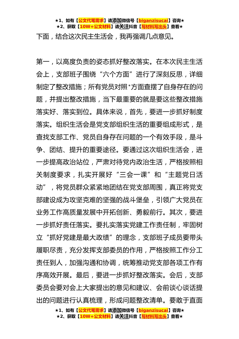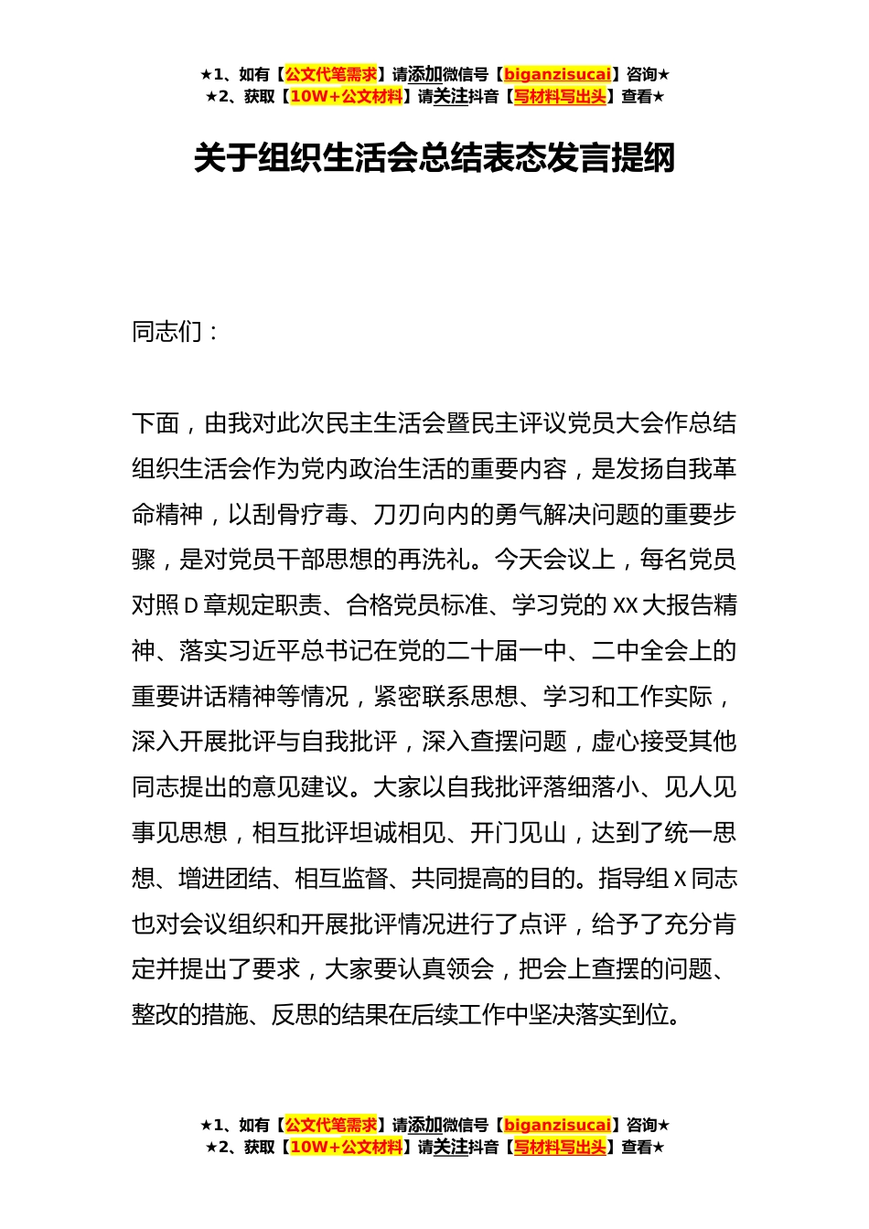 ★1、如有【公文代笔需求】请添加微信号【biganzisucai】咨询★★2、获取【10W+公文材料】请关注抖音【写材料写出头】查看★关于组织生活会总结表态发言提纲同志们:下面,由我对此次民主生活会暨民主评议党员大会作总结组织生活会作为党内政治生活的重要内容,是发扬自我革命精神,以刮骨疗毒、刀刃向内的勇气解决问题的重要步骤,是对党员干部思想的再洗礼。今天会议上,每名党员对照D章规定职责、合格党员标准、学习党的XX大报告精神、落实习近平总书记在党的二十届一中、二中全会上的重要讲话精神等情况,紧密联系思想、学习和工作实际,深入开展批评与自我批评,深入查摆问题,虚心接受其他同志提出的意见建议。大家以自我批评落细落小、见人见事见思想,相互批评坦诚相见、开门见山,达到了统一思想、增进团...