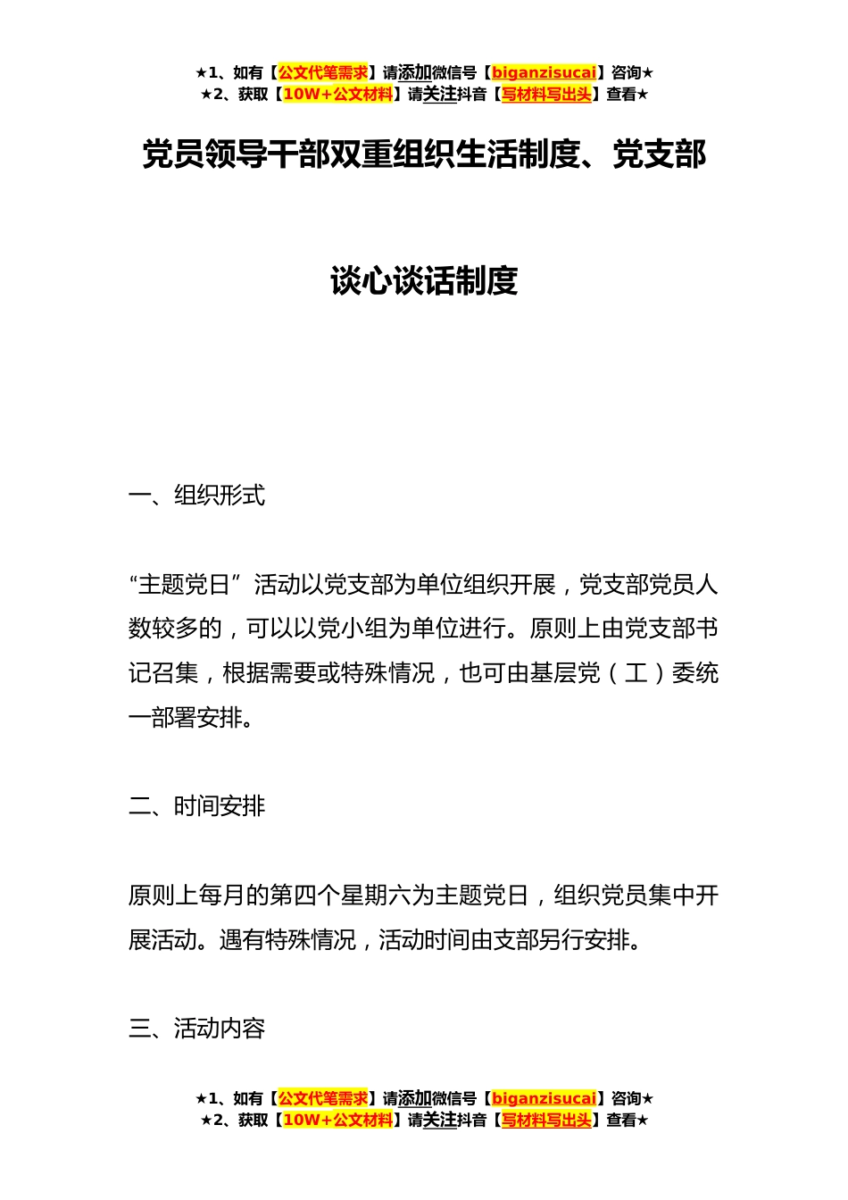 ★1、如有【公文代笔需求】请添加微信号【biganzisucai】咨询★★2、获取【10W+公文材料】请关注抖音【写材料写出头】查看★党员领导干部双重组织生活制度、党支部谈心谈话制度一、组织形式“主题党日”活动以党支部为单位组织开展,党支部党员人数较多的,可以以党小组为单位进行。原则上由党支部书记召集,根据需要或特殊情况,也可由基层党(工)委统一部署安排。二、时间安排原则上每月的第四个星期六为主题党日,组织党员集中开展活动。遇有特殊情况,活动时间由支部另行安排。三、活动内容★1、如有【公文代笔需求】请添加微信号【biganzisucai】咨询★★2、获取【10W+公文材料】请关注抖音【写材料写出头】查看★★1、如有【公文代笔需求】请添加微信号【biganzisucai】咨询★★2、获取【10W+公文材料】请...