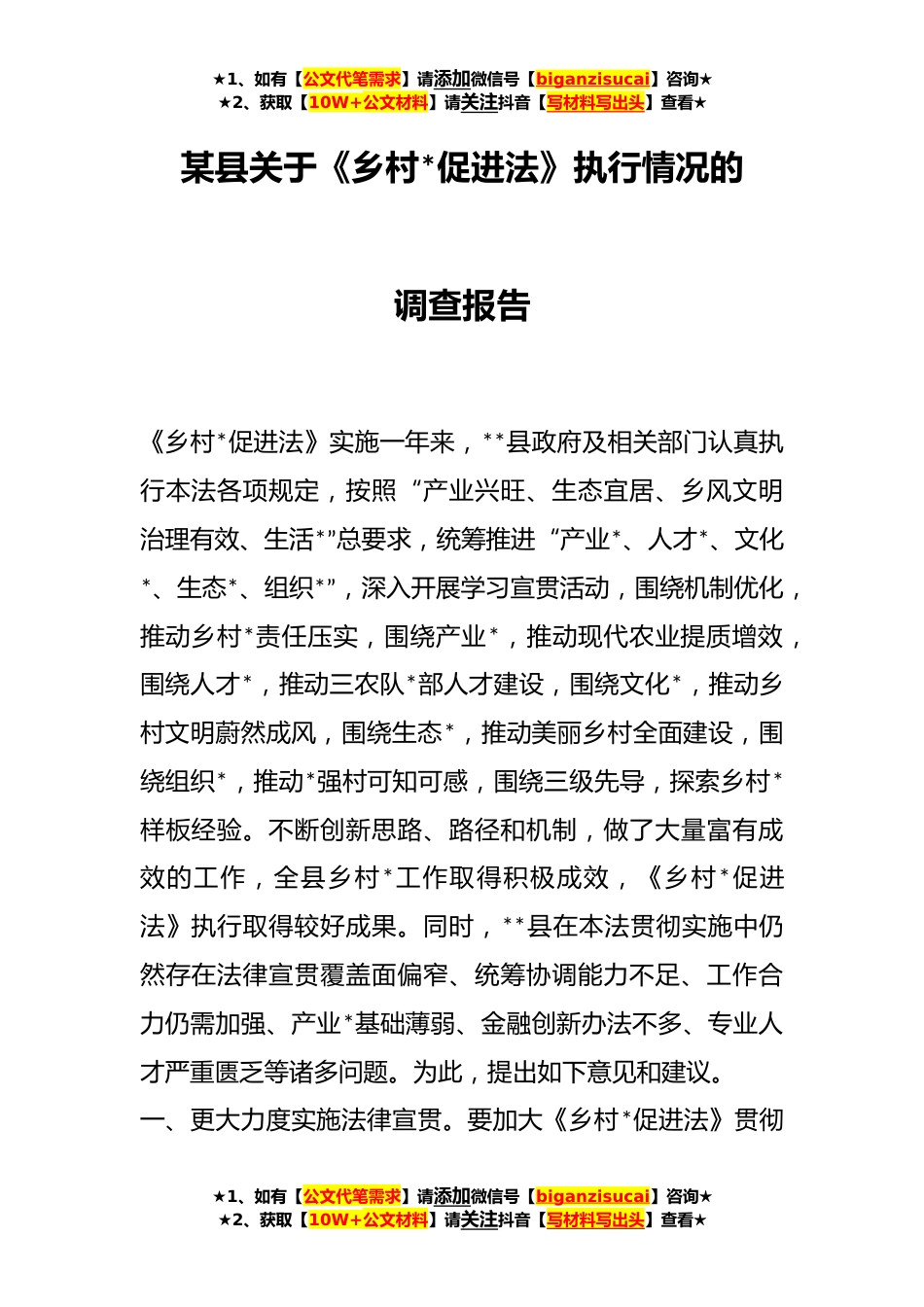 ★1、如有【公文代笔需求】请添加微信号【biganzisucai】咨询★★2、获取【10W+公文材料】请关注抖音【写材料写出头】查看★某县关于《乡村*促进法》执行情况的调查报告《乡村*促进法》实施一年来,**县政府及相关部门认真执行本法各项规定,按照“产业兴旺、生态宜居、乡风文明治理有效、生活*”总要求,统筹推进“产业*、人才*、文化*、生态*、组织*”,深入开展学习宣贯活动,围绕机制优化,推动乡村*责任压实,围绕产业*,推动现代农业提质增效,围绕人才*,推动三农队*部人才建设,围绕文化*,推动乡村文明蔚然成风,围绕生态*,推动美丽乡村全面建设,围绕组织*,推动*强村可知可感,围绕三级先导,探索乡村*样板经验。不断创新思路、路径和机制,做了大量富有成效的工作,全县乡村*工作取得积极成效,《乡...