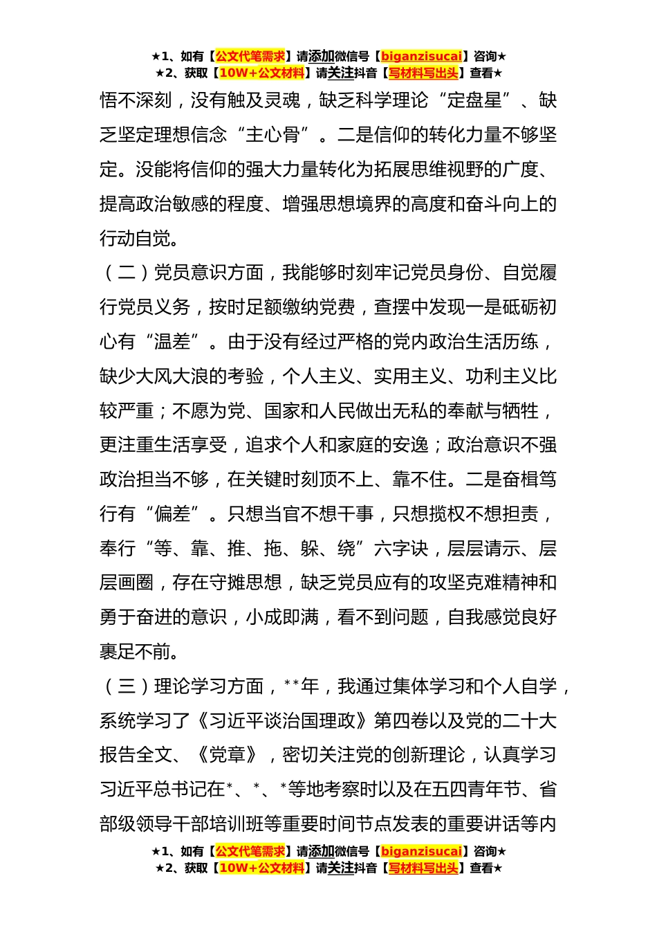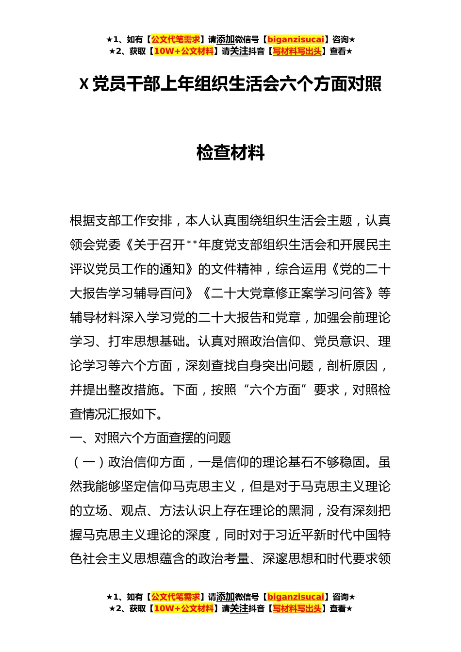 ★1、如有【公文代笔需求】请添加微信号【biganzisucai】咨询★★2、获取【10W+公文材料】请关注抖音【写材料写出头】查看★X党员干部上年组织生活会六个方面对照检查材料根据支部工作安排,本人认真围绕组织生活会主题,认真领会党委《关于召开**年度党支部组织生活会和开展民主评议党员工作的通知》的文件精神,综合运用《党的二十大报告学习辅导百问》《二十大党章修正案学习问答》等辅导材料深入学习党的二十大报告和党章,加强会前理论学习、打牢思想基础。认真对照政治信仰、党员意识、理论学习等六个方面,深刻查找自身突出问题,剖析原因,并提出整改措施。下面,按照“六个方面”要求,对照检查情况汇报如下。一、对照六个方面查摆的问题(一)政治信仰方面,一是信仰的理论基石不够稳固。虽然我能够坚定...