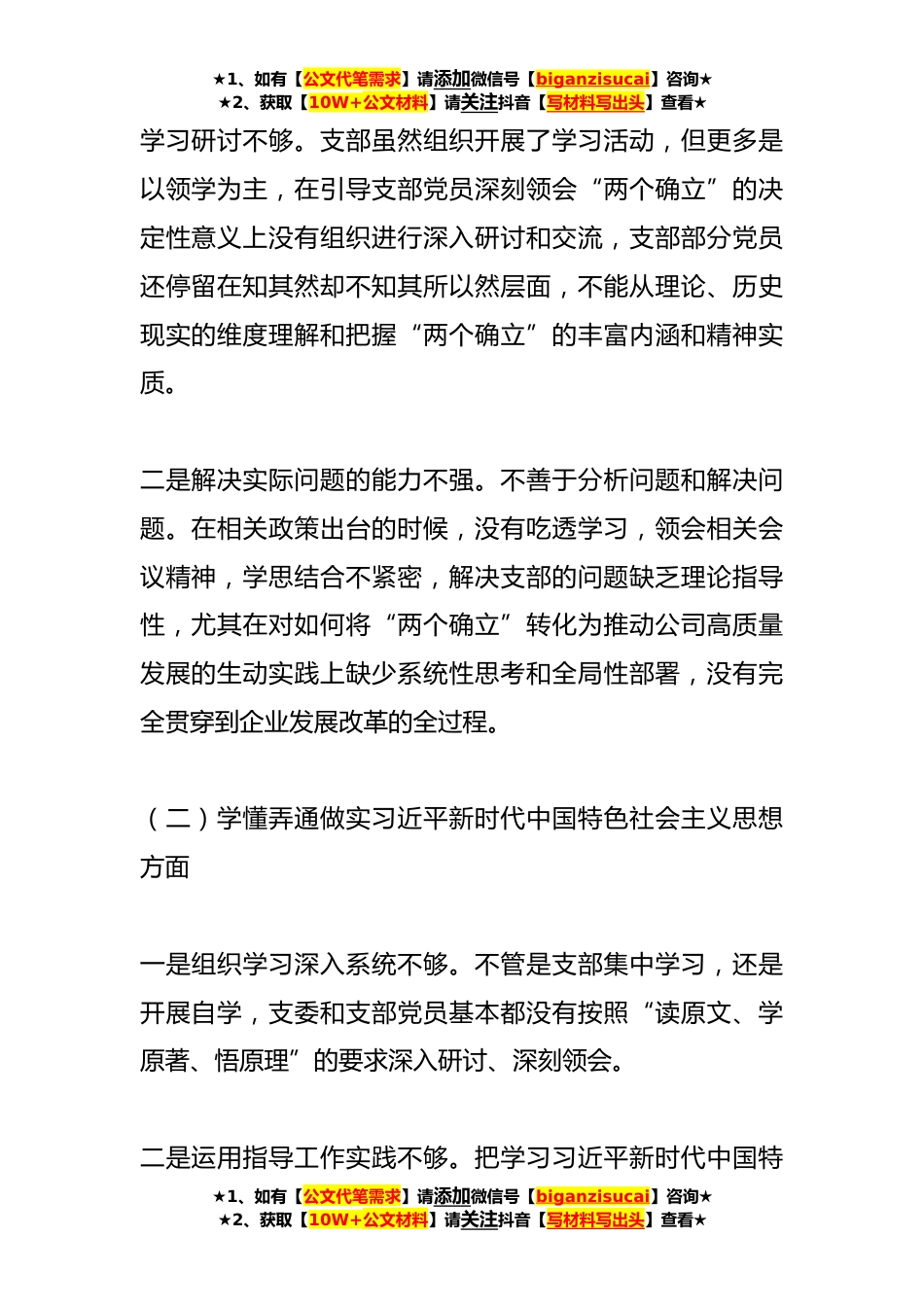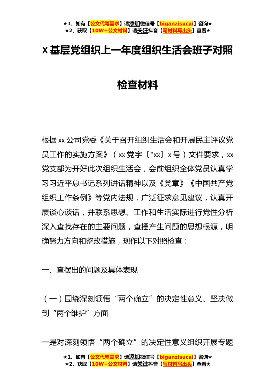 ★1、如有【公文代笔需求】请添加微信号【biganzisucai】咨询★★2、获取【10W+公文材料】请关注抖音【写材料写出头】查看★X基层党组织上一年度组织生活会班子对照检查材料根据xx公司党委《关于召开组织生活会和开展民主评议党员工作的实施方案》(xx党字〔*xx〕x号)文件要求,xx党支部为开好此次组织生活会,会前组织全体党员认真学习习近平总书记系列讲话精神以及《党章》《中国共产党组织工作条例》等党内法规,广泛征求意见建议,认真开展谈心谈话,并联系思想、工作和生活实际进行党性分析深入查找存在的主要问题,查摆产生问题的思想根源,明确努力方向和整改措施,现作以下对照检查:一、查摆出的问题及具体表现(一)围绕深刻领悟“两个确立”的决定性意义、坚决做到“两个维护”方面一是对深刻领悟“两...