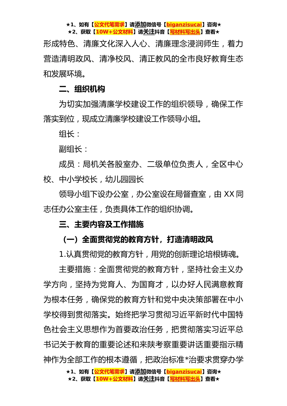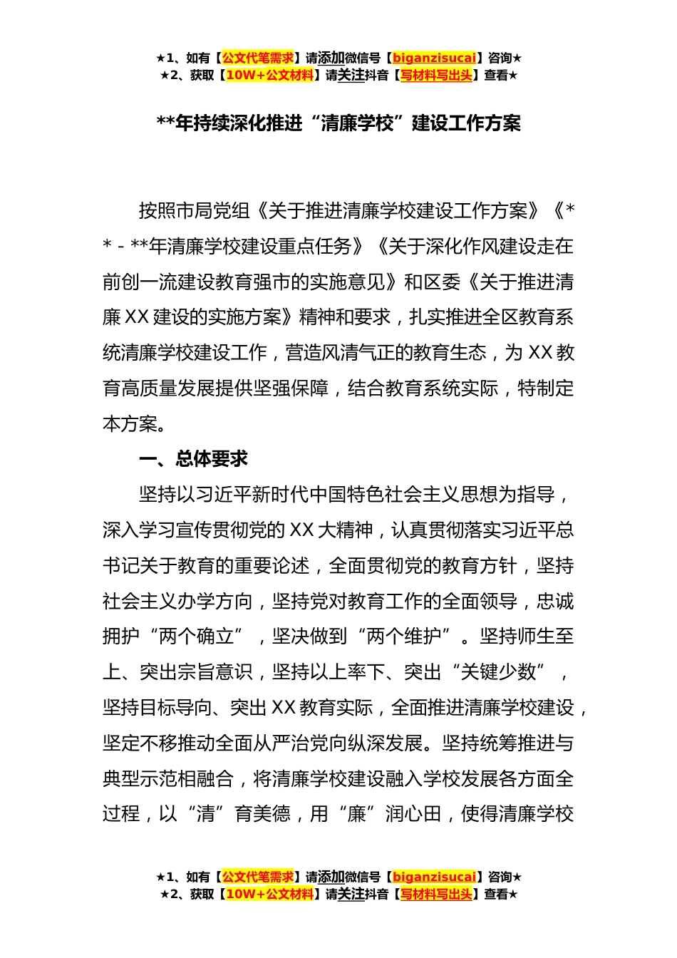 ★1、如有【公文代笔需求】请添加微信号【biganzisucai】咨询★★2、获取【10W+公文材料】请关注抖音【写材料写出头】查看★**年持续深化推进“清廉学校”建设工作方案按照市局党组《关于推进清廉学校建设工作方案》《**-**年清廉学校建设重点任务》《关于深化作风建设走在前创一流建设教育强市的实施意见》和区委《关于推进清廉XX建设的实施方案》精神和要求,扎实推进全区教育系统清廉学校建设工作,营造风清气正的教育生态,为XX教育高质量发展提供坚强保障,结合教育系统实际,特制定本方案。一、总体要求坚持以习近平新时代中国特色社会主义思想为指导,深入学习宣传贯彻党的XX大精神,认真贯彻落实习近平总书记关于教育的重要论述,全面贯彻党的教育方针,坚持社会主义办学方向,坚持党对教育工作的全面领...