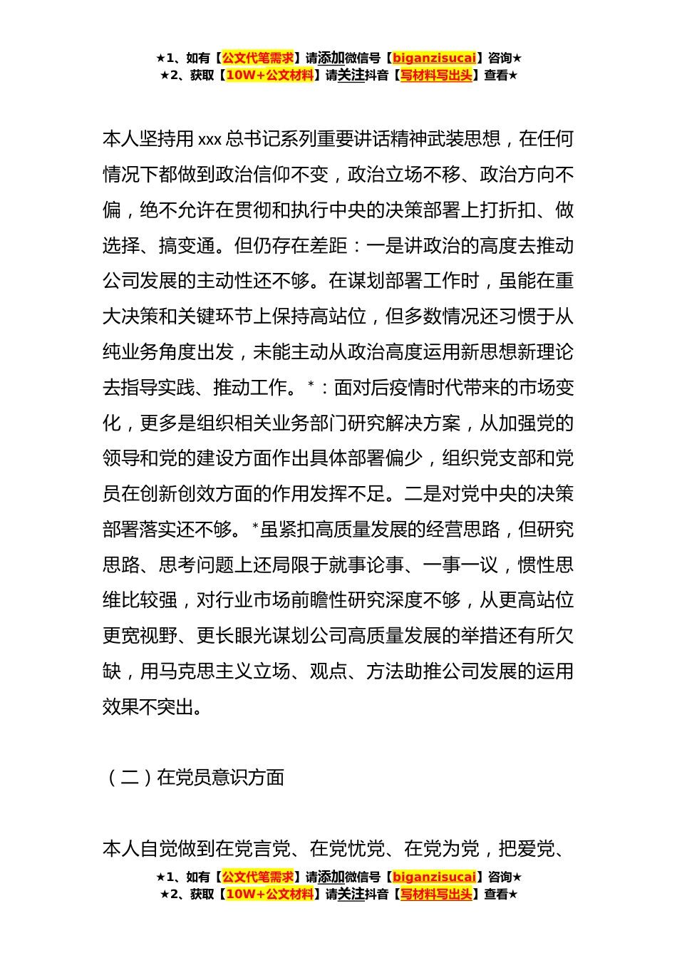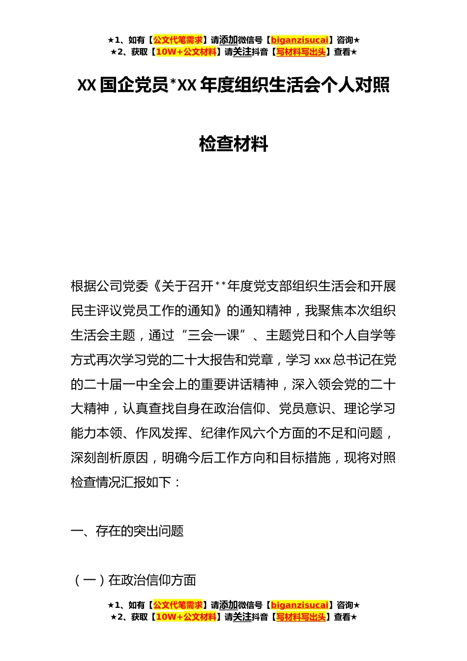 ★1、如有【公文代笔需求】请添加微信号【biganzisucai】咨询★★2、获取【10W+公文材料】请关注抖音【写材料写出头】查看★XX国企党员*XX年度组织生活会个人对照检查材料根据公司党委《关于召开**年度党支部组织生活会和开展民主评议党员工作的通知》的通知精神,我聚焦本次组织生活会主题,通过“三会一课”、主题党日和个人自学等方式再次学习党的二十大报告和党章,学习xxx总书记在党的二十届一中全会上的重要讲话精神,深入领会党的二十大精神,认真查找自身在政治信仰、党员意识、理论学习能力本领、作风发挥、纪律作风六个方面的不足和问题,深刻剖析原因,明确今后工作方向和目标措施,现将对照检查情况汇报如下:一、存在的突出问题(一)在政治信仰方面★1、如有【公文代笔需求】请添加微信号【biganzis...