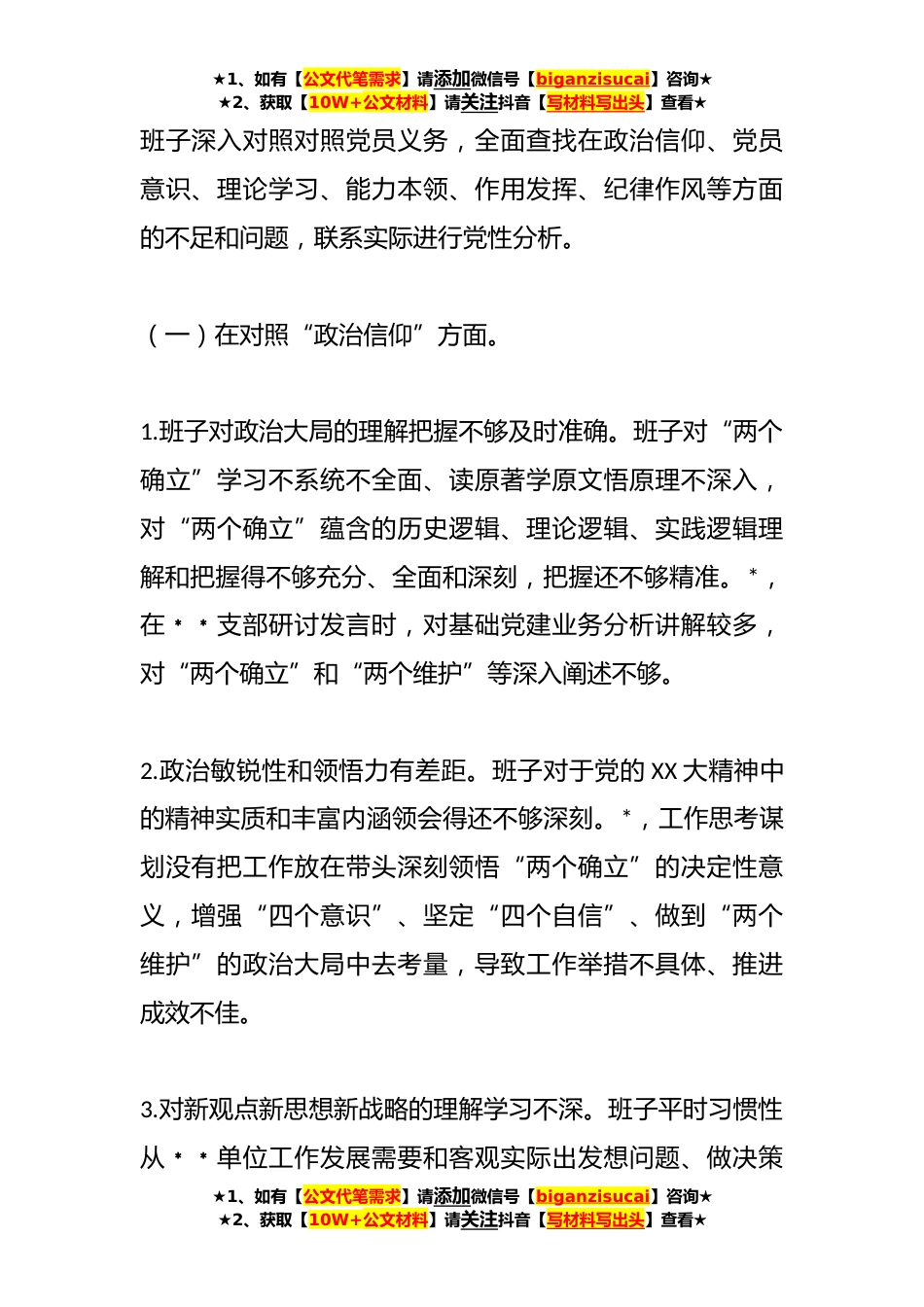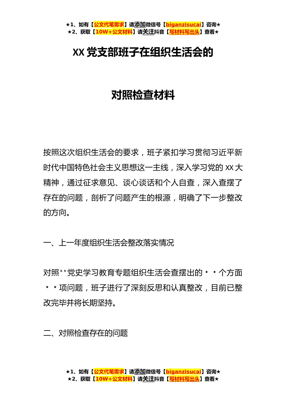 ★1、如有【公文代笔需求】请添加微信号【biganzisucai】咨询★★2、获取【10W+公文材料】请关注抖音【写材料写出头】查看★XX党支部班子在组织生活会的对照检查材料按照这次组织生活会的要求,班子紧扣学习贯彻习近平新时代中国特色社会主义思想这一主线,深入学习党的XX大精神,通过征求意见、谈心谈话和个人自查,深入查摆了存在的问题,剖析了问题产生的根源,明确了下一步整改的方向。一、上一年度组织生活会整改落实情况对照**党史学习教育专题组织生活会查摆出的﹡﹡个方面﹡﹡项问题,班子进行了深刻反思和认真整改,目前已整改完毕并将长期坚持。二、对照检查存在的问题★1、如有【公文代笔需求】请添加微信号【biganzisucai】咨询★★2、获取【10W+公文材料】请关注抖音【写材料写出头】查看★★1、如有...