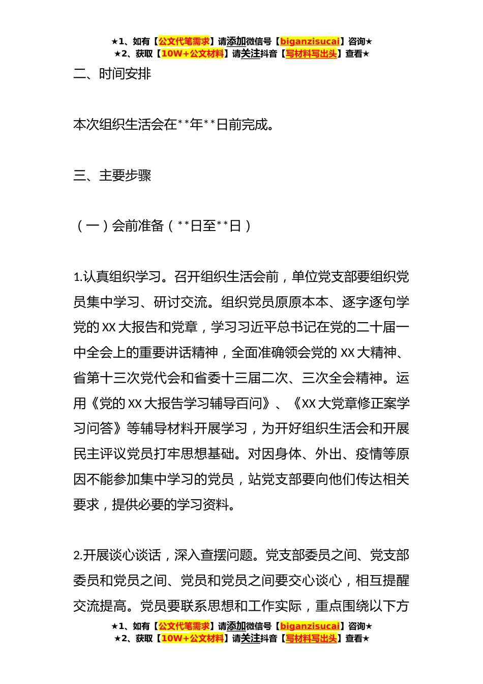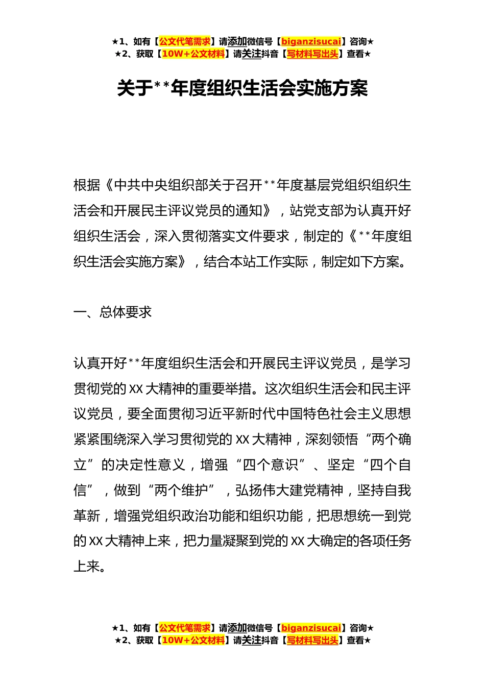 ★1、如有【公文代笔需求】请添加微信号【biganzisucai】咨询★★2、获取【10W+公文材料】请关注抖音【写材料写出头】查看★关于**年度组织生活会实施方案根据《中共中央组织部关于召开**年度基层党组织组织生活会和开展民主评议党员的通知》,站党支部为认真开好组织生活会,深入贯彻落实文件要求,制定的《**年度组织生活会实施方案》,结合本站工作实际,制定如下方案。一、总体要求认真开好**年度组织生活会和开展民主评议党员,是学习贯彻党的XX大精神的重要举措。这次组织生活会和民主评议党员,要全面贯彻习近平新时代中国特色社会主义思想紧紧围绕深入学习贯彻党的XX大精神,深刻领悟“两个确立”的决定性意义,增强“四个意识”、坚定“四个自信”,做到“两个维护”,弘扬伟大建党精神,坚持自我革新,...