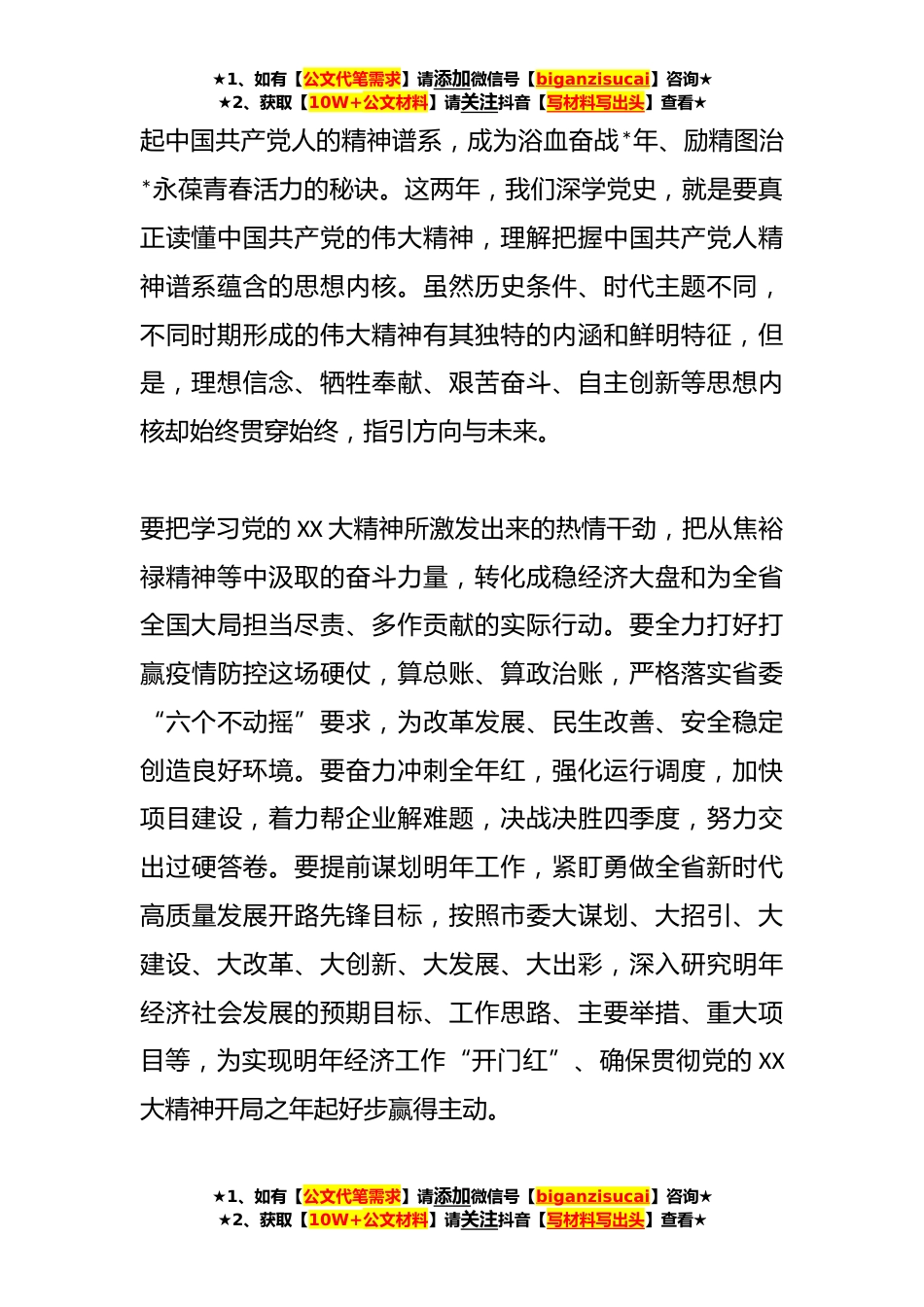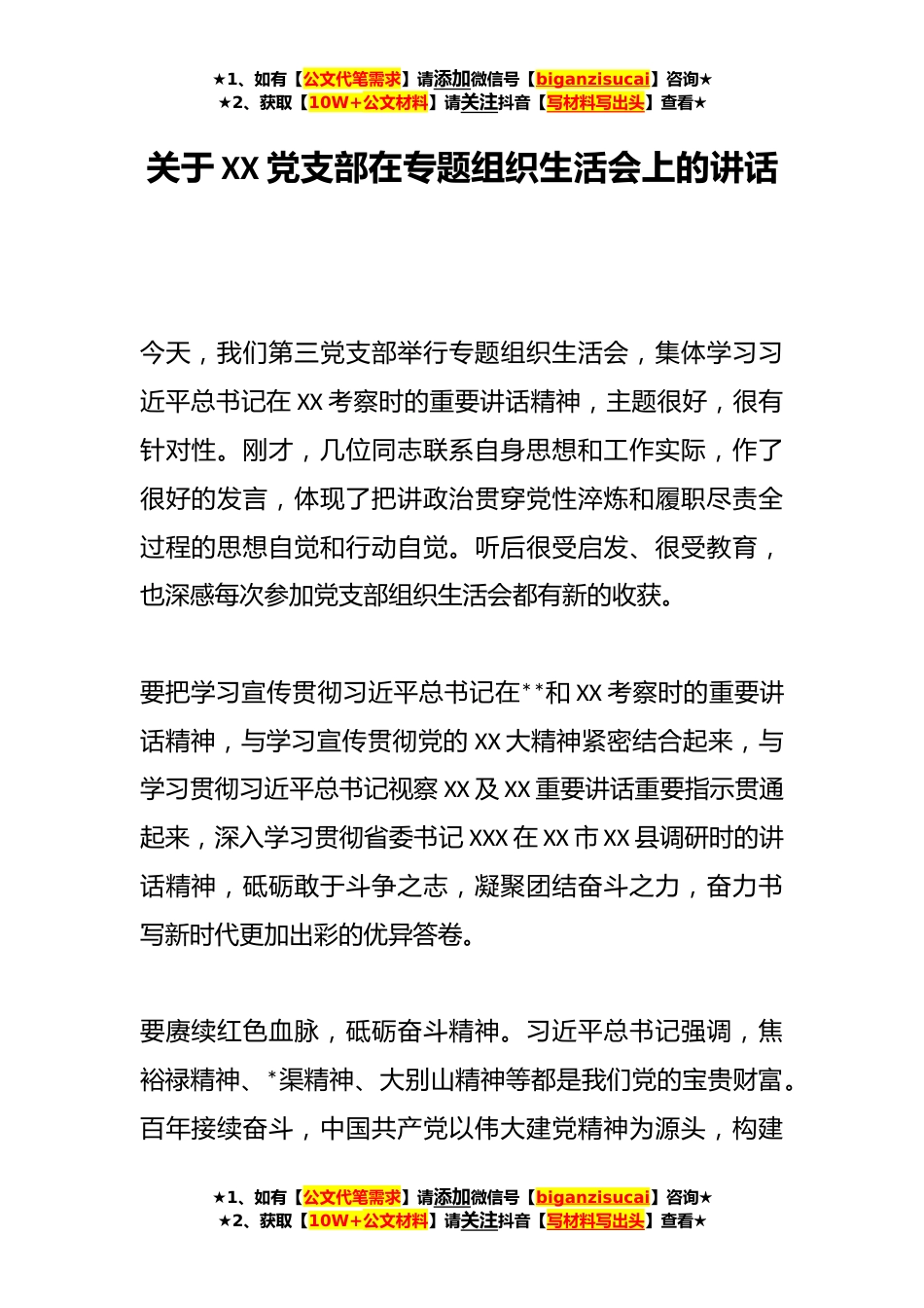 ★1、如有【公文代笔需求】请添加微信号【biganzisucai】咨询★★2、获取【10W+公文材料】请关注抖音【写材料写出头】查看★关于XX党支部在专题组织生活会上的讲话今天,我们第三党支部举行专题组织生活会,集体学习习近平总书记在XX考察时的重要讲话精神,主题很好,很有针对性。刚才,几位同志联系自身思想和工作实际,作了很好的发言,体现了把讲政治贯穿党性淬炼和履职尽责全过程的思想自觉和行动自觉。听后很受启发、很受教育,也深感每次参加党支部组织生活会都有新的收获。要把学习宣传贯彻习近平总书记在**和XX考察时的重要讲话精神,与学习宣传贯彻党的XX大精神紧密结合起来,与学习贯彻习近平总书记视察XX及XX重要讲话重要指示贯通起来,深入学习贯彻省委书记XXX在XX市XX县调研时的讲话精神,砥砺敢于斗...