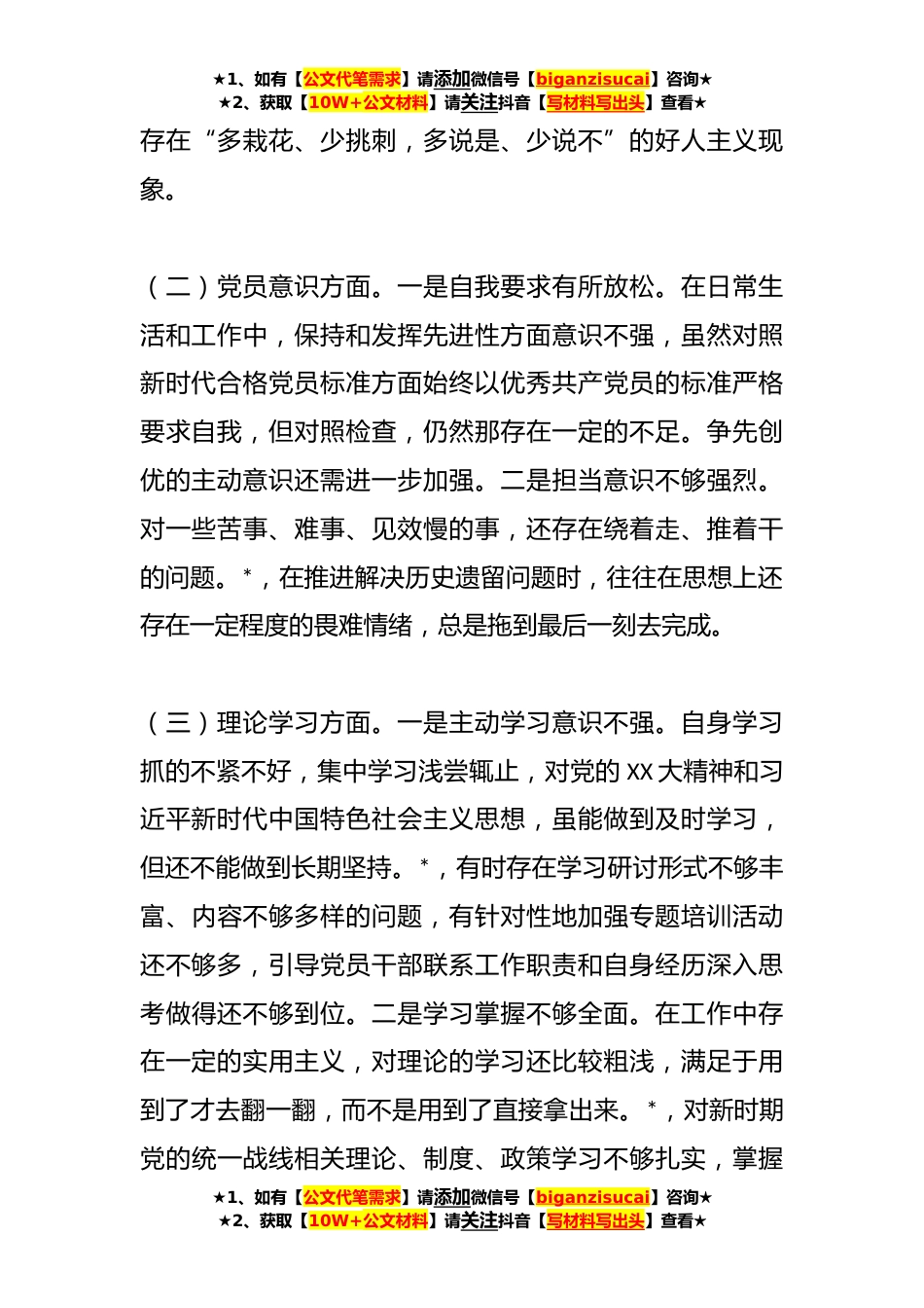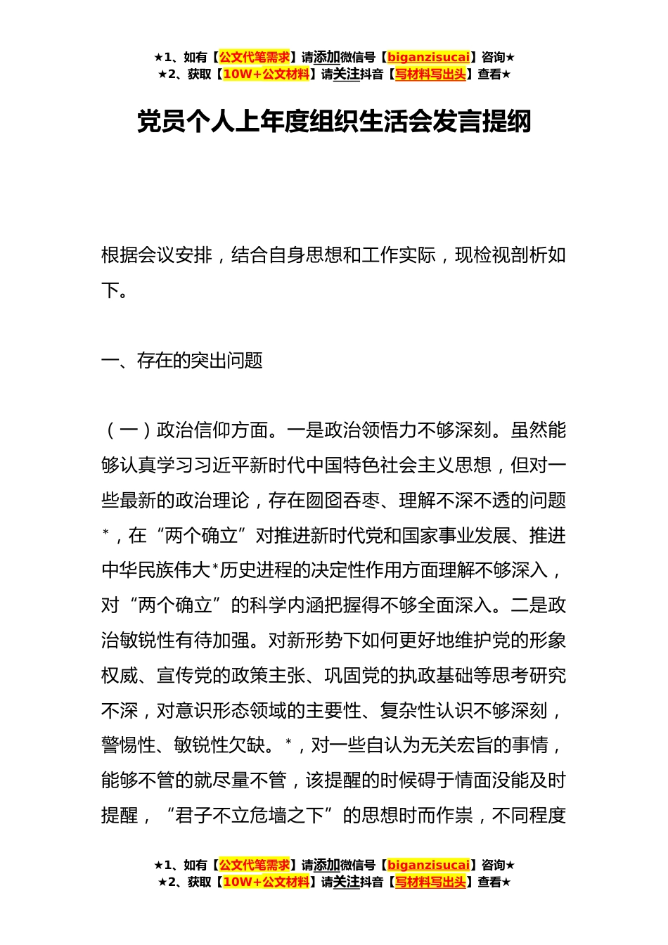 ★1、如有【公文代笔需求】请添加微信号【biganzisucai】咨询★★2、获取【10W+公文材料】请关注抖音【写材料写出头】查看★党员个人上年度组织生活会发言提纲根据会议安排,结合自身思想和工作实际,现检视剖析如下。一、存在的突出问题(一)政治信仰方面。一是政治领悟力不够深刻。虽然能够认真学习习近平新时代中国特色社会主义思想,但对一些最新的政治理论,存在囫囵吞枣、理解不深不透的问题*,在“两个确立”对推进新时代党和国家事业发展、推进中华民族伟大*历史进程的决定性作用方面理解不够深入,对“两个确立”的科学内涵把握得不够全面深入。二是政治敏锐性有待加强。对新形势下如何更好地维护党的形象权威、宣传党的政策主张、巩固党的执政基础等思考研究不深,对意识形态领域的主要性、复杂性认识...