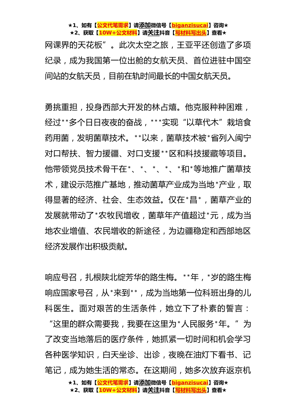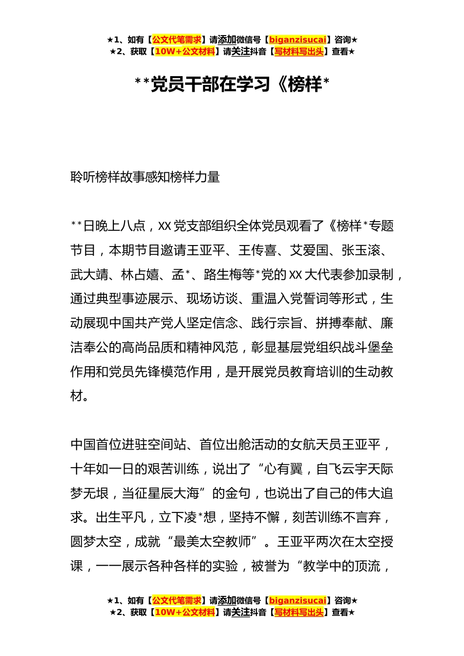 ★1、如有【公文代笔需求】请添加微信号【biganzisucai】咨询★★2、获取【10W+公文材料】请关注抖音【写材料写出头】查看★**党员干部在学习《榜样*聆听榜样故事感知榜样力量**日晚上八点,XX党支部组织全体党员观看了《榜样*专题节目,本期节目邀请王亚平、王传喜、艾爱国、张玉滚、武大靖、林占嬉、孟*、路生梅等*党的XX大代表参加录制,通过典型事迹展示、现场访谈、重温入党誓词等形式,生动展现中国共产党人坚定信念、践行宗旨、拼搏奉献、廉洁奉公的高尚品质和精神风范,彰显基层党组织战斗堡垒作用和党员先锋模范作用,是开展党员教育培训的生动教材。中国首位进驻空间站、首位出舱活动的女航天员王亚平,十年如一日的艰苦训练,说出了“心有翼,自飞云宇天际梦无垠,当征星辰大海”的金句,也说出了自己...