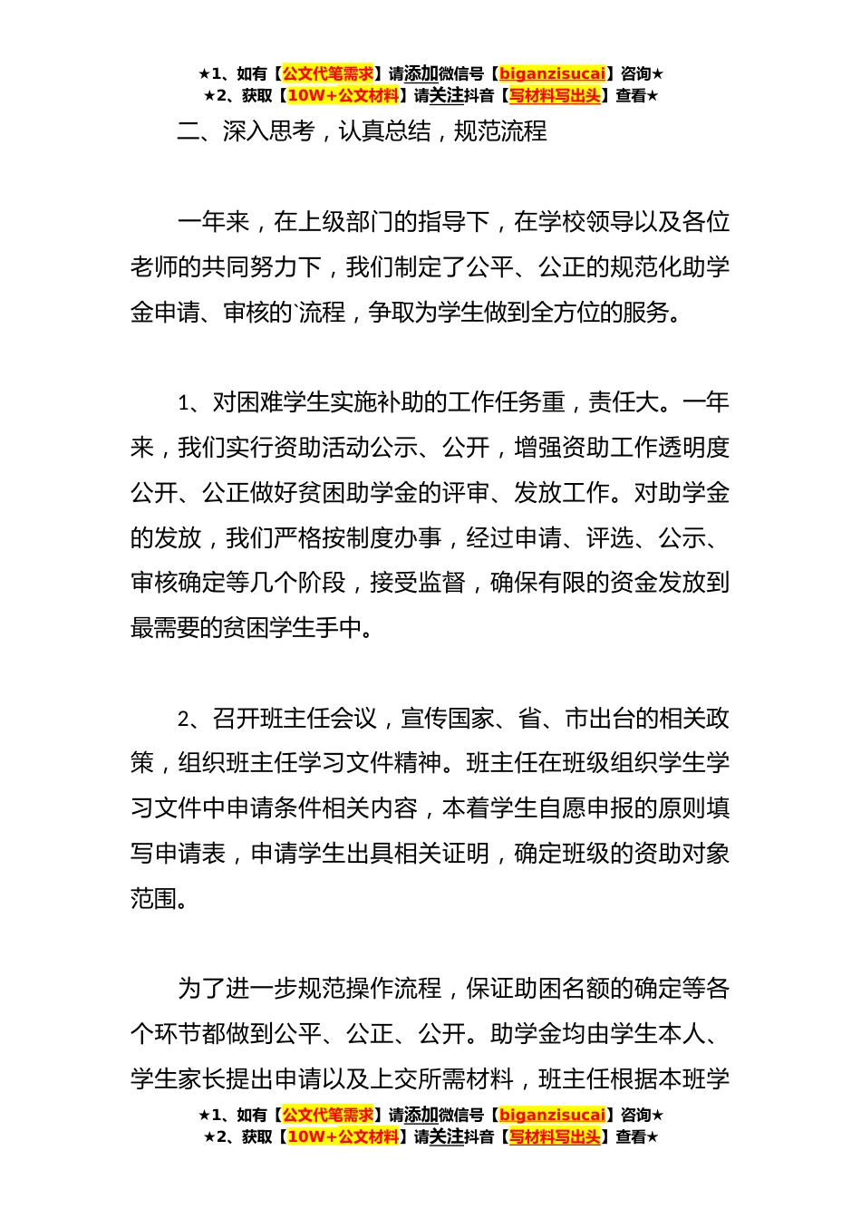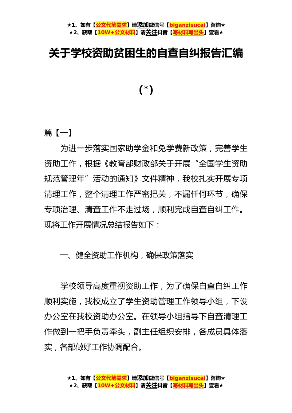 ★1、如有【公文代笔需求】请添加微信号【biganzisucai】咨询★★2、获取【10W+公文材料】请关注抖音【写材料写出头】查看★关于学校资助贫困生的自查自纠报告汇编(*)篇【一】为进一步落实国家助学金和免学费新政策,完善学生资助工作,根据《教育部财政部关于开展“全国学生资助规范管理年”活动的通知》文件精神,我校扎实开展专项清理工作,整个清理工作严密把关,不漏任何环节,确保专项治理、清查工作不走过场,顺利完成自查自纠工作。现将工作开展情况总结报告如下:一、健全资助工作机构,确保政策落实学校领导高度重视资助工作,为了确保自查自纠工作顺利实施,我校成立了学生资助管理工作领导小组,下设办公室在我校资助办公室。在领导小组指导下自查清理工作做到一把手负责牵头,副主任组织安排,各成...