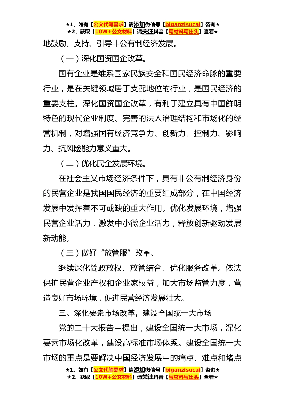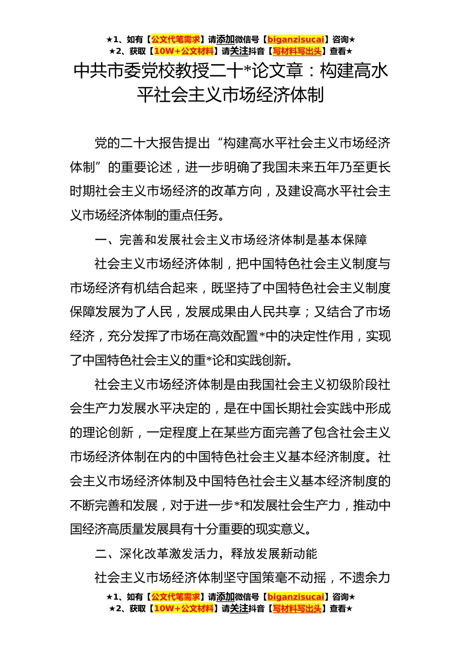 ★1、如有【公文代笔需求】请添加微信号【biganzisucai】咨询★★2、获取【10W+公文材料】请关注抖音【写材料写出头】查看★中共市委党校教授二十*论文章:构建高水平社会主义市场经济体制党的二十大报告提出“构建高水平社会主义市场经济体制”的重要论述,进一步明确了我国未来五年乃至更长时期社会主义市场经济的改革方向,及建设高水平社会主义市场经济体制的重点任务。一、完善和发展社会主义市场经济体制是基本保障社会主义市场经济体制,把中国特色社会主义制度与市场经济有机结合起来,既坚持了中国特色社会主义制度保障发展为了人民,发展成果由人民共享;又结合了市场经济,充分发挥了市场在高效配置*中的决定性作用,实现了中国特色社会主义的重*论和实践创新。社会主义市场经济体制是由我国社会主义初...