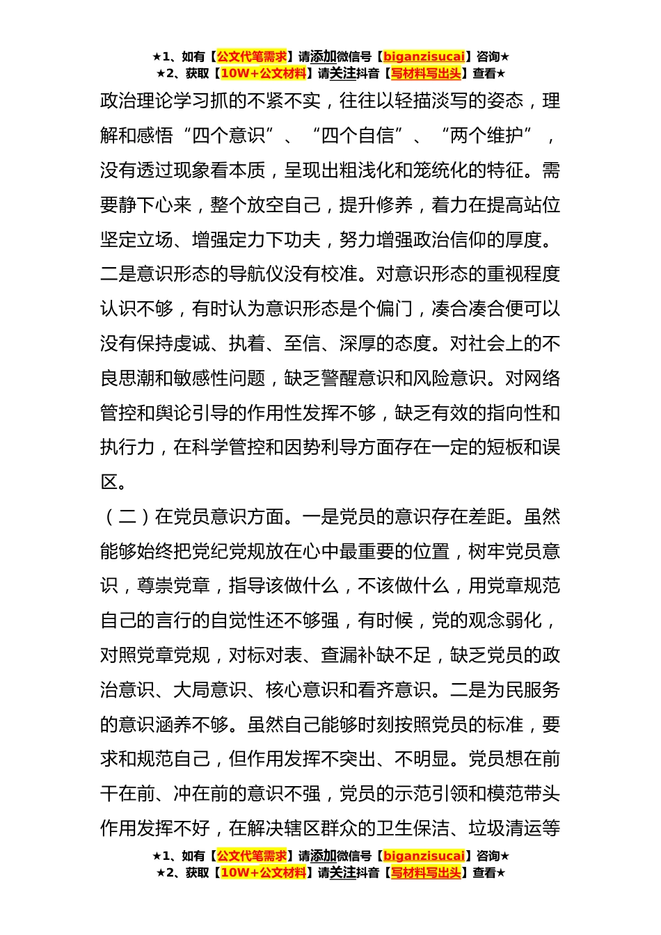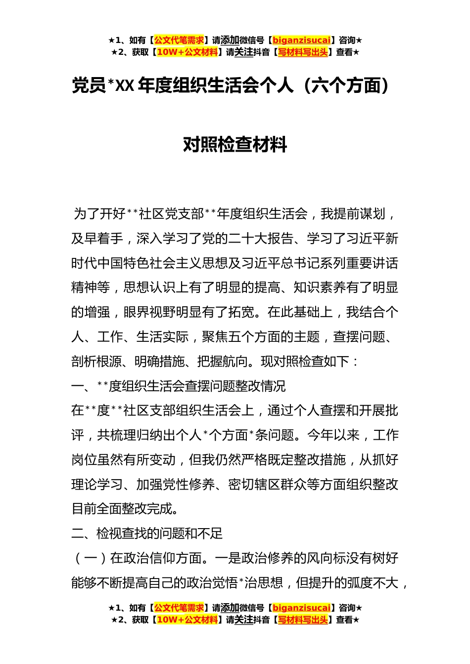 ★1、如有【公文代笔需求】请添加微信号【biganzisucai】咨询★★2、获取【10W+公文材料】请关注抖音【写材料写出头】查看★党员*XX年度组织生活会个人(六个方面)对照检查材料为了开好**社区党支部**年度组织生活会,我提前谋划,及早着手,深入学习了党的二十大报告、学习了习近平新时代中国特色社会主义思想及习近平总书记系列重要讲话精神等,思想认识上有了明显的提高、知识素养有了明显的增强,眼界视野明显有了拓宽。在此基础上,我结合个人、工作、生活实际,聚焦五个方面的主题,查摆问题、剖析根源、明确措施、把握航向。现对照检查如下:一、**度组织生活会查摆问题整改情况在**度**社区支部组织生活会上,通过个人查摆和开展批评,共梳理归纳出个人*个方面*条问题。今年以来,工作岗位虽然有所变动,...