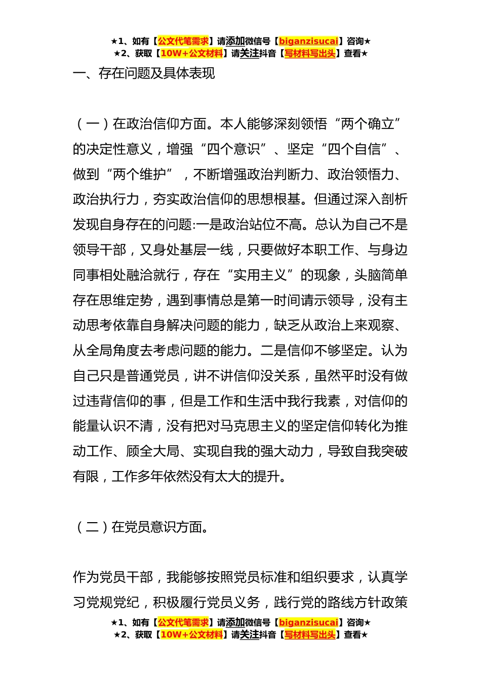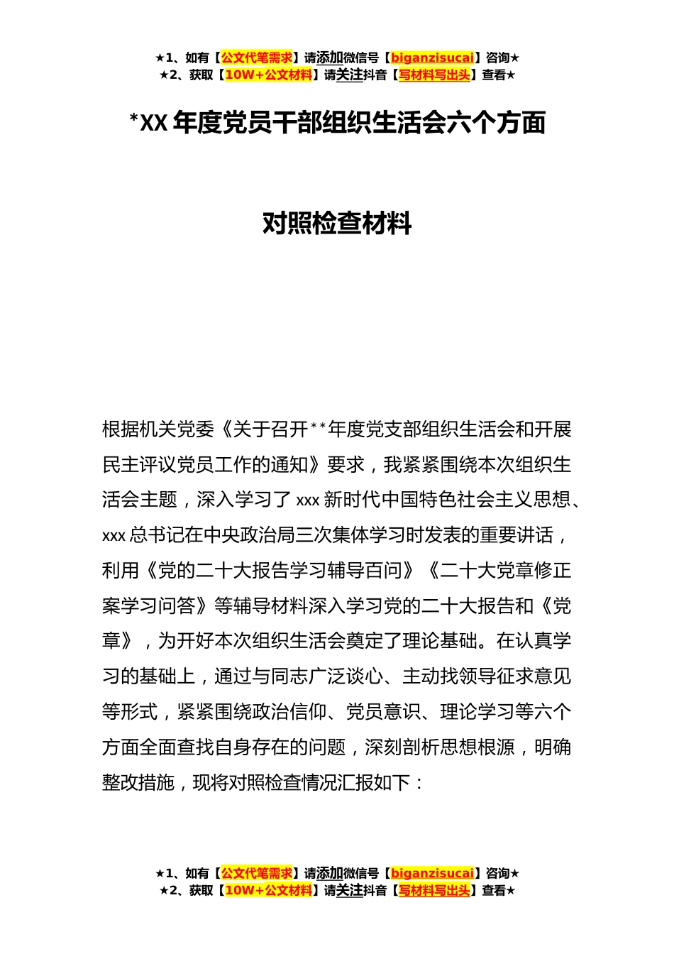 ★1、如有【公文代笔需求】请添加微信号【biganzisucai】咨询★★2、获取【10W+公文材料】请关注抖音【写材料写出头】查看★*XX年度党员干部组织生活会六个方面对照检查材料根据机关党委《关于召开**年度党支部组织生活会和开展民主评议党员工作的通知》要求,我紧紧围绕本次组织生活会主题,深入学习了xxx新时代中国特色社会主义思想、xxx总书记在中央政治局三次集体学习时发表的重要讲话,利用《党的二十大报告学习辅导百问》《二十大党章修正案学习问答》等辅导材料深入学习党的二十大报告和《党章》,为开好本次组织生活会奠定了理论基础。在认真学习的基础上,通过与同志广泛谈心、主动找领导征求意见等形式,紧紧围绕政治信仰、党员意识、理论学习等六个方面全面查找自身存在的问题,深刻剖析思想根源,明确...