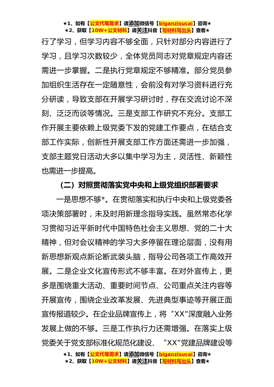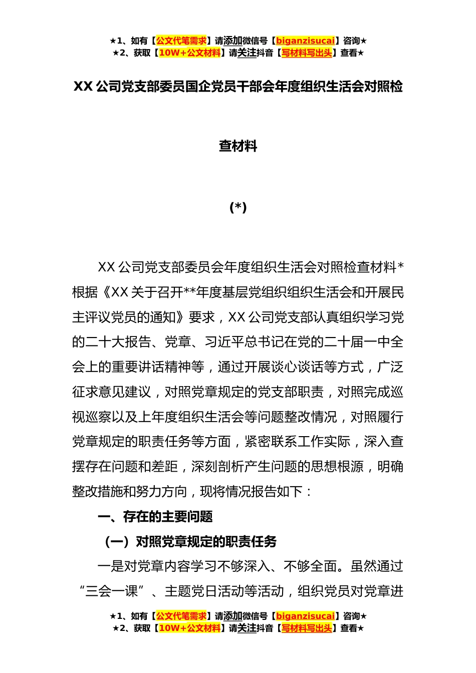 ★1、如有【公文代笔需求】请添加微信号【biganzisucai】咨询★★2、获取【10W+公文材料】请关注抖音【写材料写出头】查看★XX公司党支部委员国企党员干部会年度组织生活会对照检查材料(*)XX公司党支部委员会年度组织生活会对照检查材料*根据《XX关于召开**年度基层党组织组织生活会和开展民主评议党员的通知》要求,XX公司党支部认真组织学习党的二十大报告、党章、习近平总书记在党的二十届一中全会上的重要讲话精神等,通过开展谈心谈话等方式,广泛征求意见建议,对照党章规定的党支部职责,对照完成巡视巡察以及上年度组织生活会等问题整改情况,对照履行党章规定的职责任务等方面,紧密联系工作实际,深入查摆存在问题和差距,深刻剖析产生问题的思想根源,明确整改措施和努力方向,现将情况报告如下:一、...
