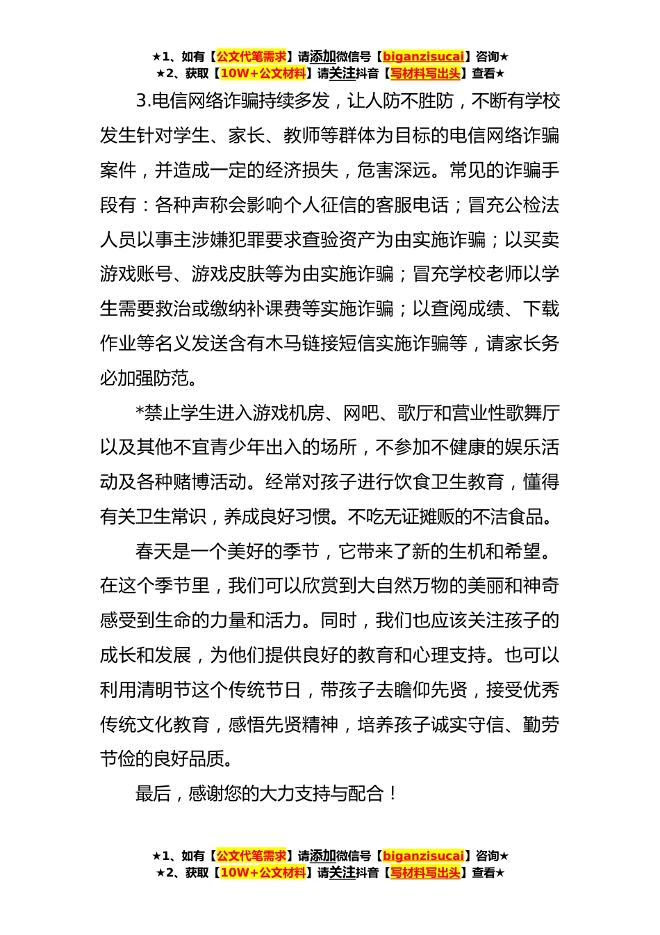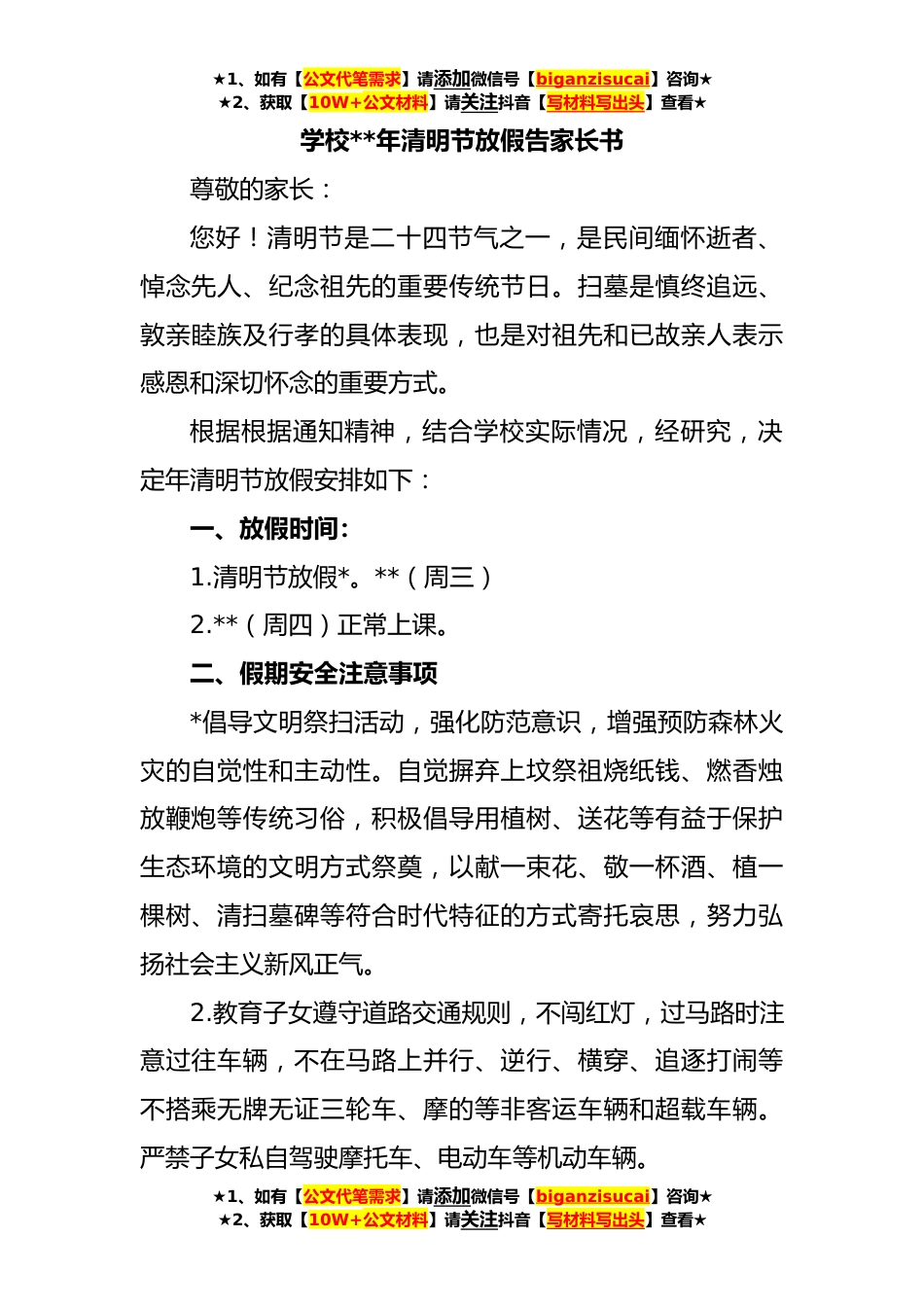 ★1、如有【公文代笔需求】请添加微信号【biganzisucai】咨询★★2、获取【10W+公文材料】请关注抖音【写材料写出头】查看★学校**年清明节放假告家长书尊敬的家长:您好!清明节是二十四节气之一,是民间缅怀逝者、悼念先人、纪念祖先的重要传统节日。扫墓是慎终追远、敦亲睦族及行孝的具体表现,也是对祖先和已故亲人表示感恩和深切怀念的重要方式。根据根据通知精神,结合学校实际情况,经研究,决定年清明节放假安排如下:一、放假时间:1.清明节放假*。**(周三)2.**(周四)正常上课。二、假期安全注意事项*倡导文明祭扫活动,强化防范意识,增强预防森林火灾的自觉性和主动性。自觉摒弃上坟祭祖烧纸钱、燃香烛放鞭炮等传统习俗,积极倡导用植树、送花等有益于保护生态环境的文明方式祭奠,以献一束花、敬...