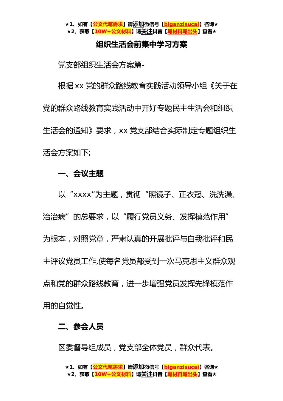 ★1、如有【公文代笔需求】请添加微信号【biganzisucai】咨询★★2、获取【10W+公文材料】请关注抖音【写材料写出头】查看★组织生活会前集中学习方案党支部组织生活会方案篇-根据xx党的群众路线教育实践活动领导小组《关于在党的群众路线教育实践活动中开好专题民主生活会和组织生活会的通知》要求,xx党支部结合实际制定专题组织生活会方案如下;一、会议主题以“xxxx”为主题,贯彻“照镜子、正衣冠、洗洗澡、治治病”的总要求,以“履行党员义务、发挥模范作用”为根本,对照党章,严肃认真的开展批评与自我批评和民主评议党员工作,使每名党员都受到一次马克思主义群众观点和党的群众路线教育,进一步增强党员发挥先锋模范作用的自觉性。二、参会人员区委督导组成员,党支部全体党员,群众代表。★1、如有【公...