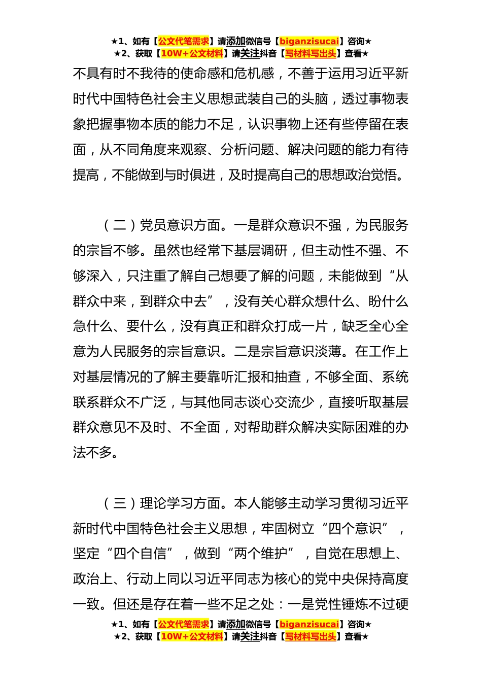 ★1、如有【公文代笔需求】请添加微信号【biganzisucai】咨询★★2、获取【10W+公文材料】请关注抖音【写材料写出头】查看★X党员干部在组织生活会六个方面个人对照检查材料按照上级对这次组织生活会有关要求,本人结合思想工作、生活实际,对照政治信仰、党员意识、理论学习、能力本领、作用发挥和纪律作风六个方面深刻剖析自身存在的突出问题,并进行了认真反思产生问题的原因,提出了整改措施。下面我将个人对照检查情况汇报如下:一、对照六个方面查摆的问题(一)政治信仰方面。一是理想信念不够坚定。有时错误的认为理想信念比较抽象,共产主义比较遥远,工作生活中有一定的现实主义和功利主义思想,没有自觉做到像老一辈革命家、优秀共产党员那样为理想信念而奋不顾身地去拼搏、去奋斗、献出自己的全部精力...