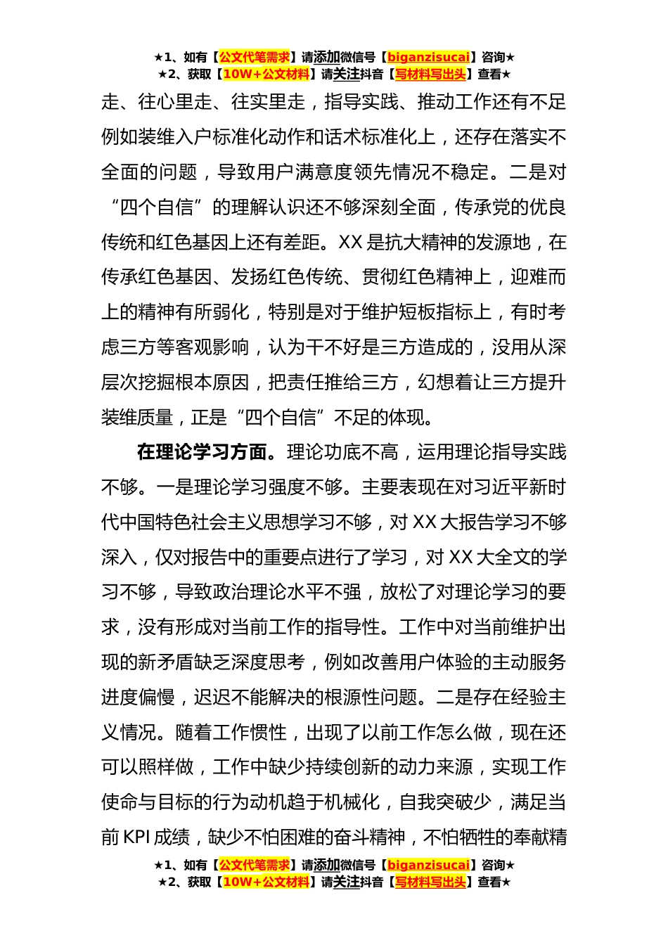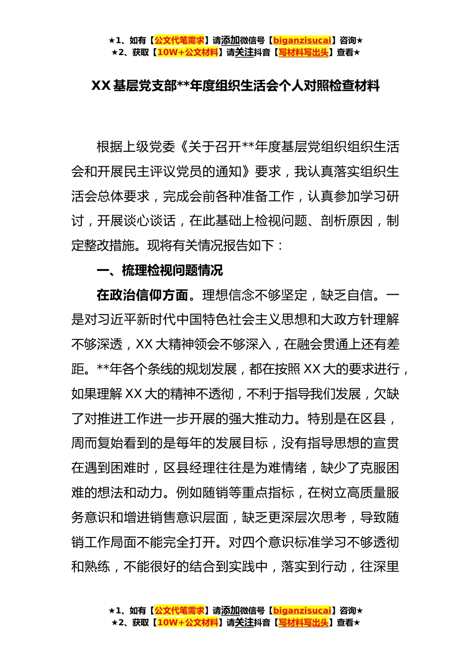 ★1、如有【公文代笔需求】请添加微信号【biganzisucai】咨询★★2、获取【10W+公文材料】请关注抖音【写材料写出头】查看★XX基层党支部**年度组织生活会个人对照检查材料根据上级党委《关于召开**年度基层党组织组织生活会和开展民主评议党员的通知》要求,我认真落实组织生活会总体要求,完成会前各种准备工作,认真参加学习研讨,开展谈心谈话,在此基础上检视问题、剖析原因,制定整改措施。现将有关情况报告如下:一、梳理检视问题情况在政治信仰方面。理想信念不够坚定,缺乏自信。一是对习近平新时代中国特色社会主义思想和大政方针理解不够深透,XX大精神领会不够深入,在融会贯通上还有差距。**年各个条线的规划发展,都在按照XX大的要求进行,如果理解XX大的精神不透彻,不利于指导我们发展,欠缺了对...