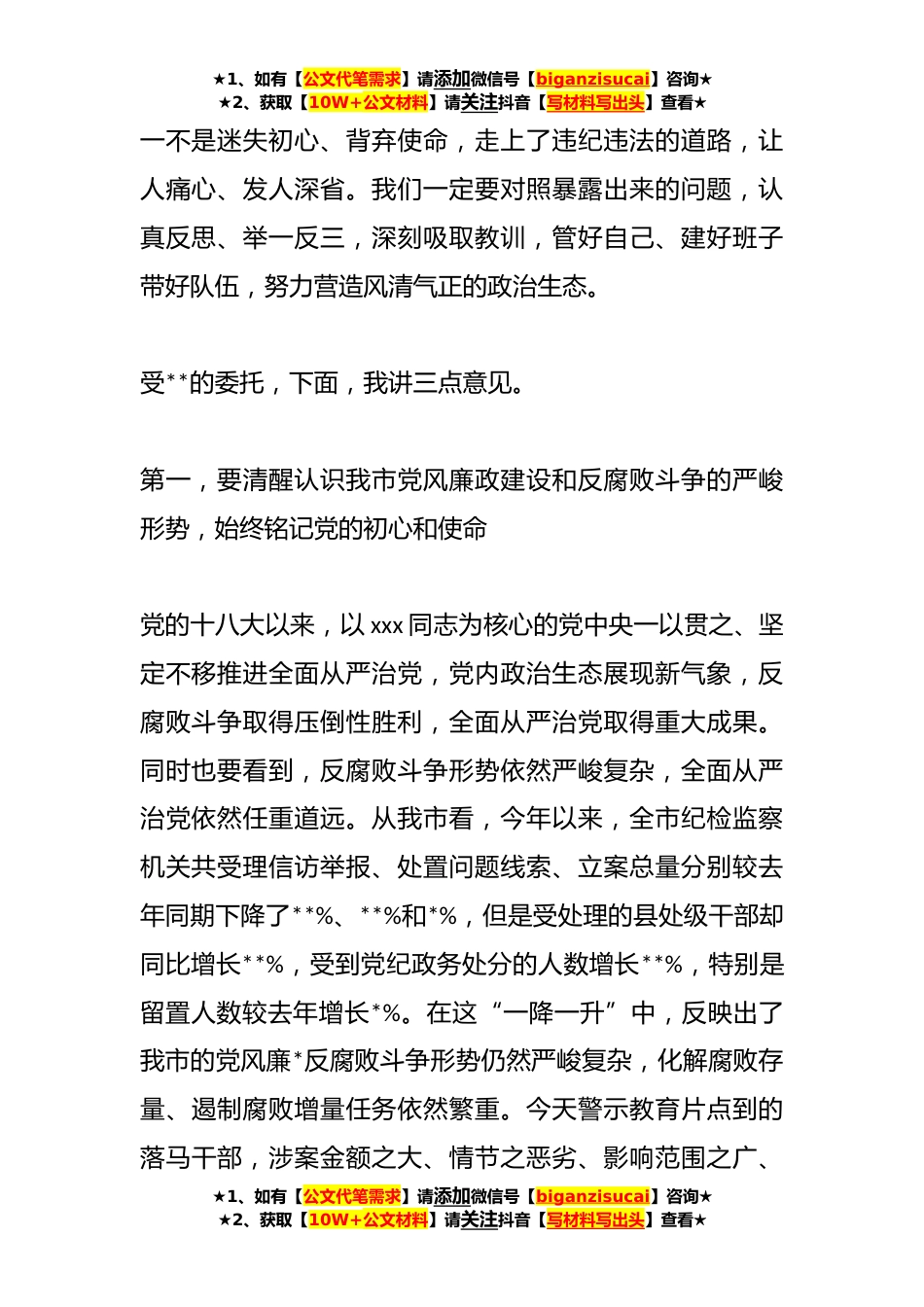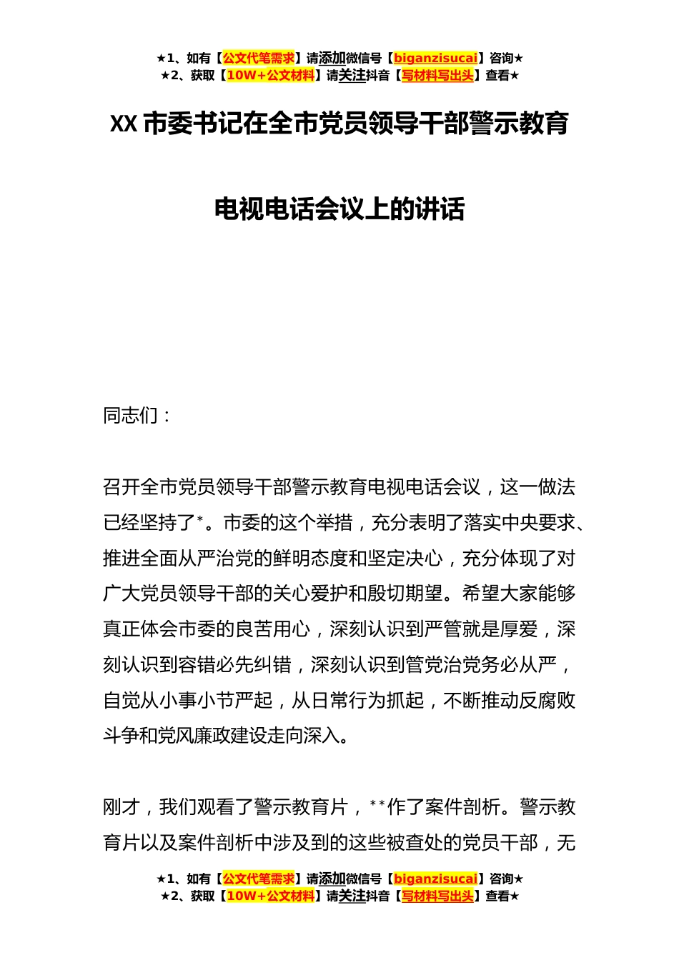 ★1、如有【公文代笔需求】请添加微信号【biganzisucai】咨询★★2、获取【10W+公文材料】请关注抖音【写材料写出头】查看★XX市委书记在全市党员领导干部警示教育电视电话会议上的讲话同志们:召开全市党员领导干部警示教育电视电话会议,这一做法已经坚持了*。市委的这个举措,充分表明了落实中央要求、推进全面从严治党的鲜明态度和坚定决心,充分体现了对广大党员领导干部的关心爱护和殷切期望。希望大家能够真正体会市委的良苦用心,深刻认识到严管就是厚爱,深刻认识到容错必先纠错,深刻认识到管党治党务必从严,自觉从小事小节严起,从日常行为抓起,不断推动反腐败斗争和党风廉政建设走向深入。刚才,我们观看了警示教育片,**作了案件剖析。警示教育片以及案件剖析中涉及到的这些被查处的党员干部,无★...