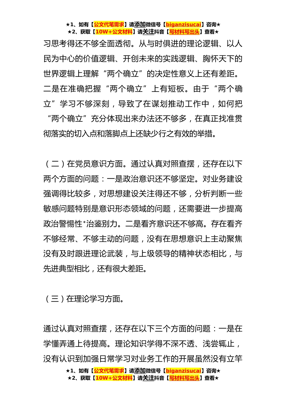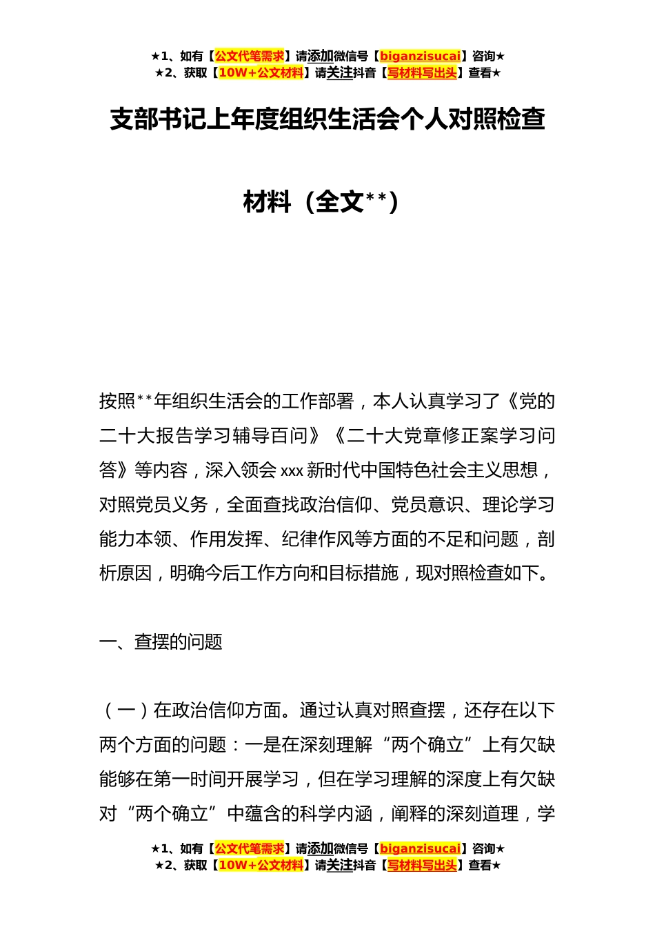★1、如有【公文代笔需求】请添加微信号【biganzisucai】咨询★★2、获取【10W+公文材料】请关注抖音【写材料写出头】查看★支部书记上年度组织生活会个人对照检查材料(全文**)按照**年组织生活会的工作部署,本人认真学习了《党的二十大报告学习辅导百问》《二十大党章修正案学习问答》等内容,深入领会xxx新时代中国特色社会主义思想,对照党员义务,全面查找政治信仰、党员意识、理论学习能力本领、作用发挥、纪律作风等方面的不足和问题,剖析原因,明确今后工作方向和目标措施,现对照检查如下。一、查摆的问题(一)在政治信仰方面。通过认真对照查摆,还存在以下两个方面的问题:一是在深刻理解“两个确立”上有欠缺能够在第一时间开展学习,但在学习理解的深度上有欠缺对“两个确立”中蕴含的科学内涵,...