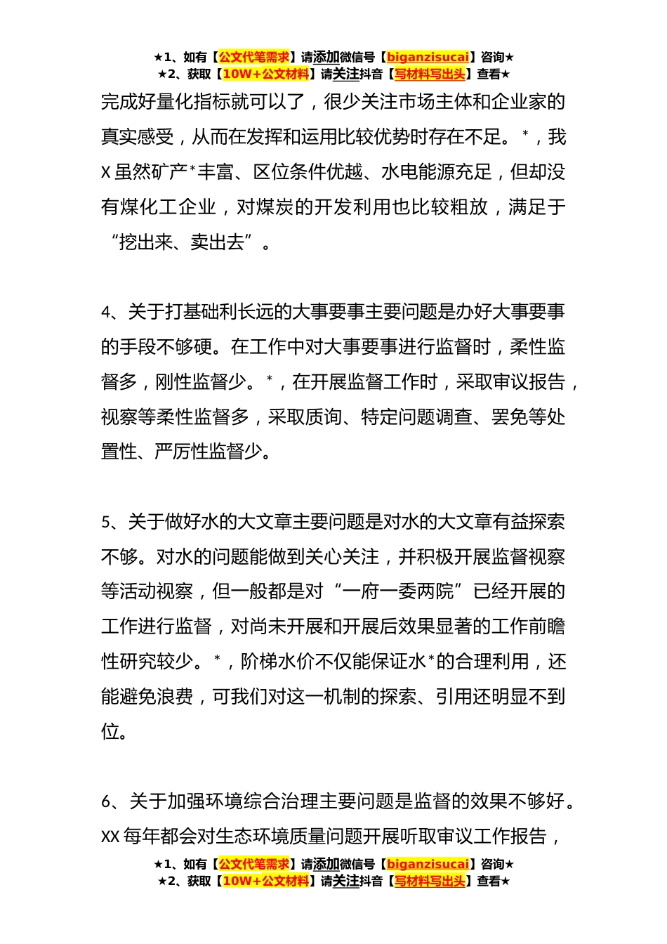 ★1、如有【公文代笔需求】请添加微信号【biganzisucai】咨询★★2、获取【10W+公文材料】请关注抖音【写材料写出头】查看★XX党员年度组织生活会对照检查材料一、对照XX书记在省管主要领导干部专题研讨班上提出的十二个问题方面1、关于转型发展主要问题是对转型发展认识不够。认为转型发展的关键在X委*府,XX只需发挥好监督作用就可以了,因此在工作中常偏重于听报告、提意见、做调研,且大多限于某一问题或某一企业,难以形成系统全面的监督体系。2、关于能源革命综合改革试点主要问题是对国家最新政策挖掘不深。没有第一时间吃透政策,也没有及时将最新政策与我X实际相结合,因而在发挥XX职能作用和推动政策落实上有不足。*,在推动煤炭清洁高效开发利用时,对《XX省煤炭清洁高效利用促进条例》贯彻落实情况监...