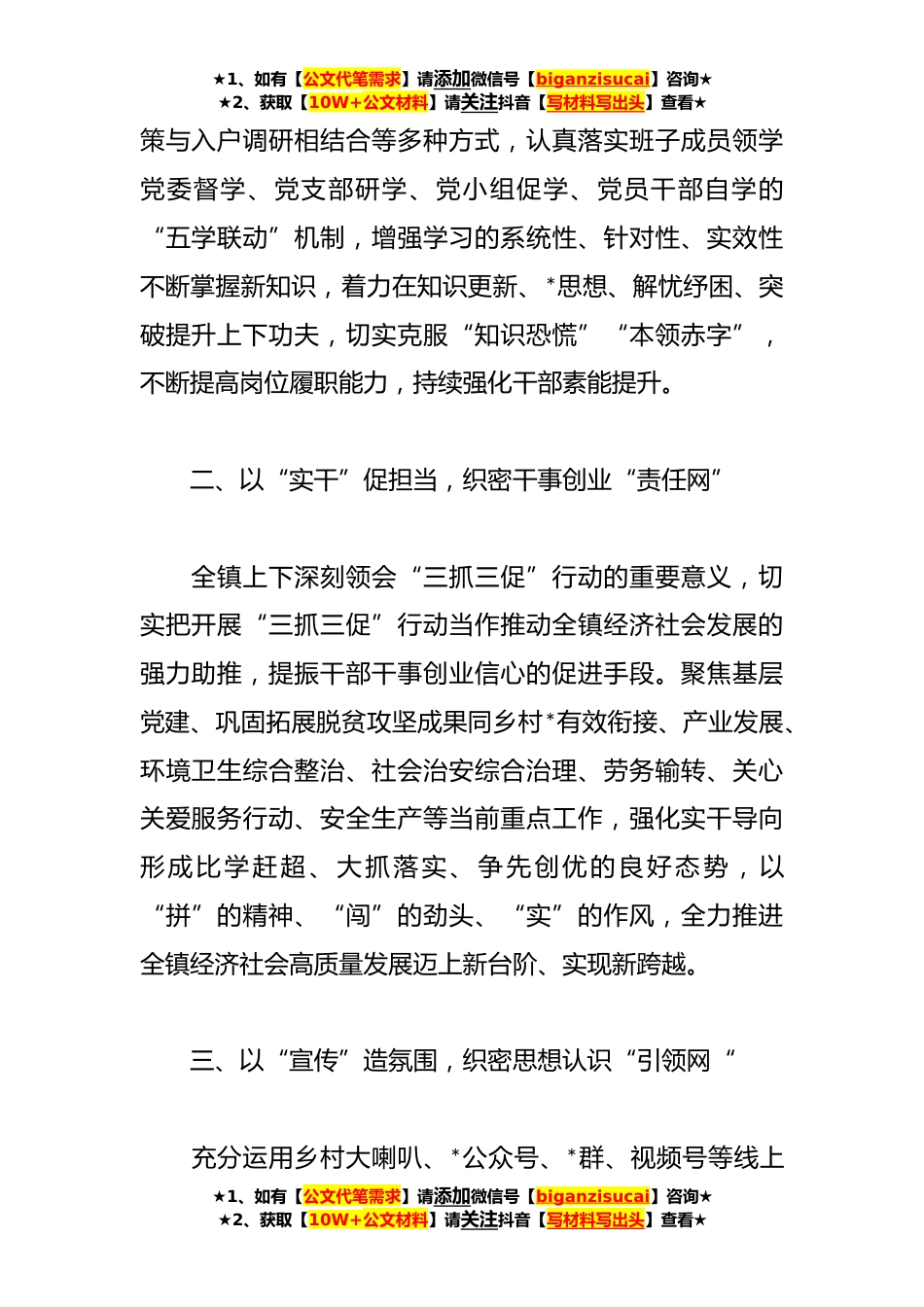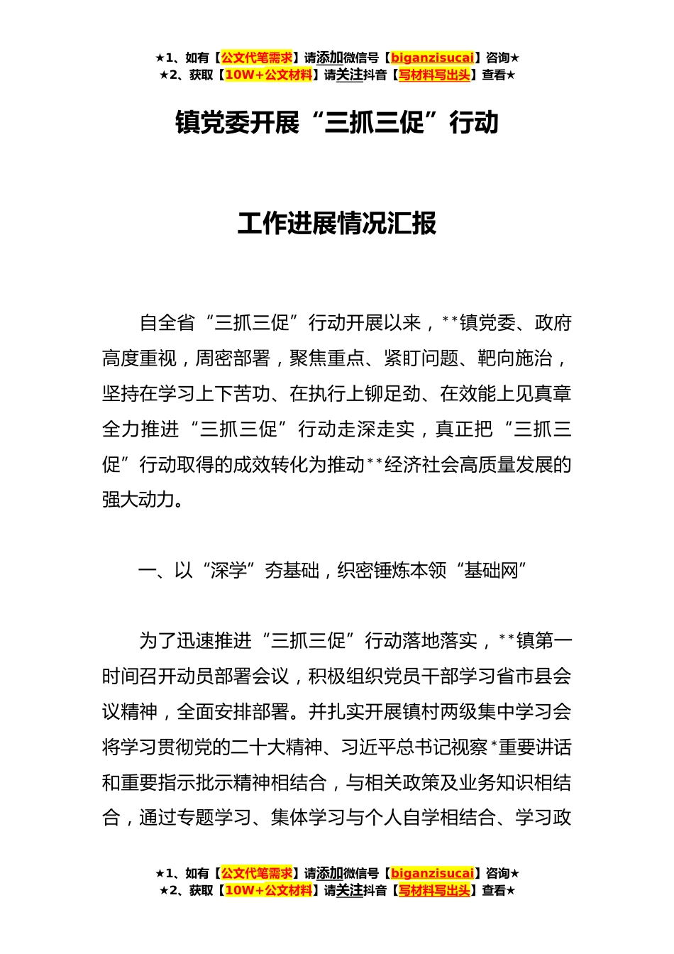★1、如有【公文代笔需求】请添加微信号【biganzisucai】咨询★★2、获取【10W+公文材料】请关注抖音【写材料写出头】查看★镇党委开展“三抓三促”行动工作进展情况汇报自全省“三抓三促”行动开展以来,**镇党委、政府高度重视,周密部署,聚焦重点、紧盯问题、靶向施治,坚持在学习上下苦功、在执行上铆足劲、在效能上见真章全力推进“三抓三促”行动走深走实,真正把“三抓三促”行动取得的成效转化为推动**经济社会高质量发展的强大动力。一、以“深学”夯基础,织密锤炼本领“基础网”为了迅速推进“三抓三促”行动落地落实,**镇第一时间召开动员部署会议,积极组织党员干部学习省市县会议精神,全面安排部署。并扎实开展镇村两级集中学习会将学习贯彻党的二十大精神、习近平总书记视察*重要讲话和重要指示...