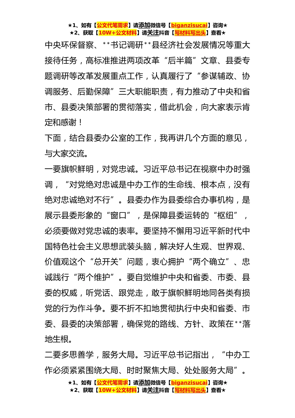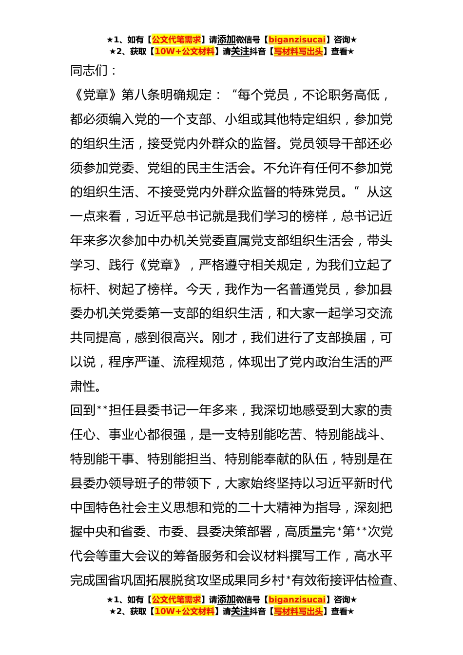 ★1、如有【公文代笔需求】请添加微信号【biganzisucai】咨询★★2、获取【10W+公文材料】请关注抖音【写材料写出头】查看★同志们:《党章》第八条明确规定:“每个党员,不论职务高低,都必须编入党的一个支部、小组或其他特定组织,参加党的组织生活,接受党内外群众的监督。党员领导干部还必须参加党委、党组的民主生活会。不允许有任何不参加党的组织生活、不接受党内外群众监督的特殊党员。”从这一点来看,习近平总书记就是我们学习的榜样,总书记近年来多次参加中办机关党委直属党支部组织生活会,带头学习、践行《党章》,严格遵守相关规定,为我们立起了标杆、树起了榜样。今天,我作为一名普通党员,参加县委办机关党委第一支部的组织生活,和大家一起学习交流共同提高,感到很高兴。刚才,我们进行了...