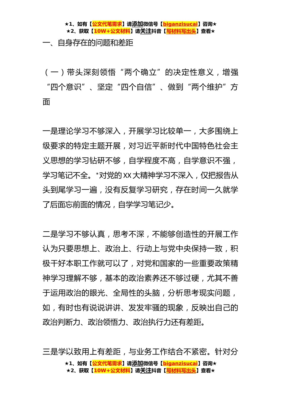 ★1、如有【公文代笔需求】请添加微信号【biganzisucai】咨询★★2、获取【10W+公文材料】请关注抖音【写材料写出头】查看★**年XX区分管领导六个带头专题民主生活会个人对照检查材料按照区纪委机关、区委组织部关于召开**年度民主生活会相关通知要求和局党委部署安排,会前,我紧扣本次民主生活会主题,即全面贯彻习近平新时代中国特色社会主义思想,深刻领悟“两个确立”的决定性意义,增强“四个意识”,坚定“四个自信”,团结带领党员干部群众以奋发有为的精神贯彻落实党的XX大作出的重大决策部署。进一步深化习习近平新时代中国特色社全主义思想和党的XX大精神,认真听取了单位同志对我个人提出的意见建议,联系一年来的思想和工作实际,结合自查自纠和征求意见围绕“六个带头”查找自身差距和不足,对照党...