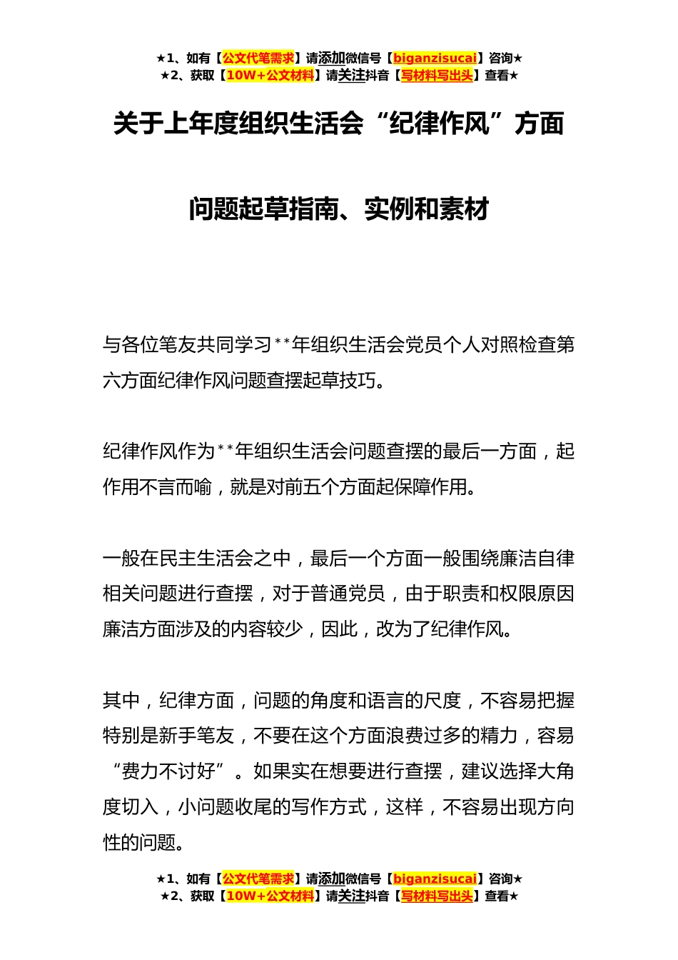 ★1、如有【公文代笔需求】请添加微信号【biganzisucai】咨询★★2、获取【10W+公文材料】请关注抖音【写材料写出头】查看★关于上年度组织生活会“纪律作风”方面问题起草指南、实例和素材与各位笔友共同学习**年组织生活会党员个人对照检查第六方面纪律作风问题查摆起草技巧。纪律作风作为**年组织生活会问题查摆的最后一方面,起作用不言而喻,就是对前五个方面起保障作用。一般在民主生活会之中,最后一个方面一般围绕廉洁自律相关问题进行查摆,对于普通党员,由于职责和权限原因廉洁方面涉及的内容较少,因此,改为了纪律作风。其中,纪律方面,问题的角度和语言的尺度,不容易把握特别是新手笔友,不要在这个方面浪费过多的精力,容易“费力不讨好”。如果实在想要进行查摆,建议选择大角度切入,小问题收...