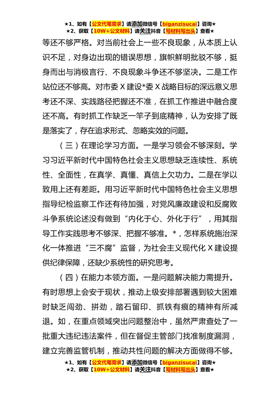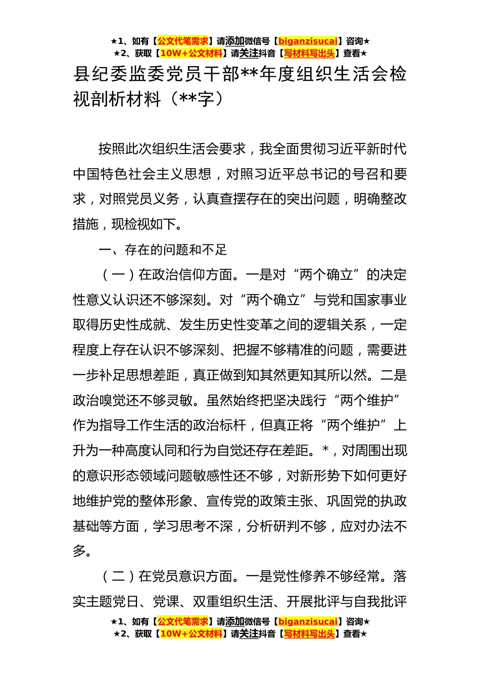 ★1、如有【公文代笔需求】请添加微信号【biganzisucai】咨询★★2、获取【10W+公文材料】请关注抖音【写材料写出头】查看★县纪委监委党员干部**年度组织生活会检视剖析材料(**字)按照此次组织生活会要求,我全面贯彻习近平新时代中国特色社会主义思想,对照习近平总书记的号召和要求,对照党员义务,认真查摆存在的突出问题,明确整改措施,现检视如下。一、存在的问题和不足(一)在政治信仰方面。一是对“两个确立”的决定性意义认识还不够深刻。对“两个确立”与党和国家事业取得历史性成就、发生历史性变革之间的逻辑关系,一定程度上存在认识不够深刻、把握不够精准的问题,需要进一步补足思想差距,真正做到知其然更知其所以然。二是政治嗅觉还不够灵敏。虽然始终把坚决践行“两个维护”作为指导工作生...