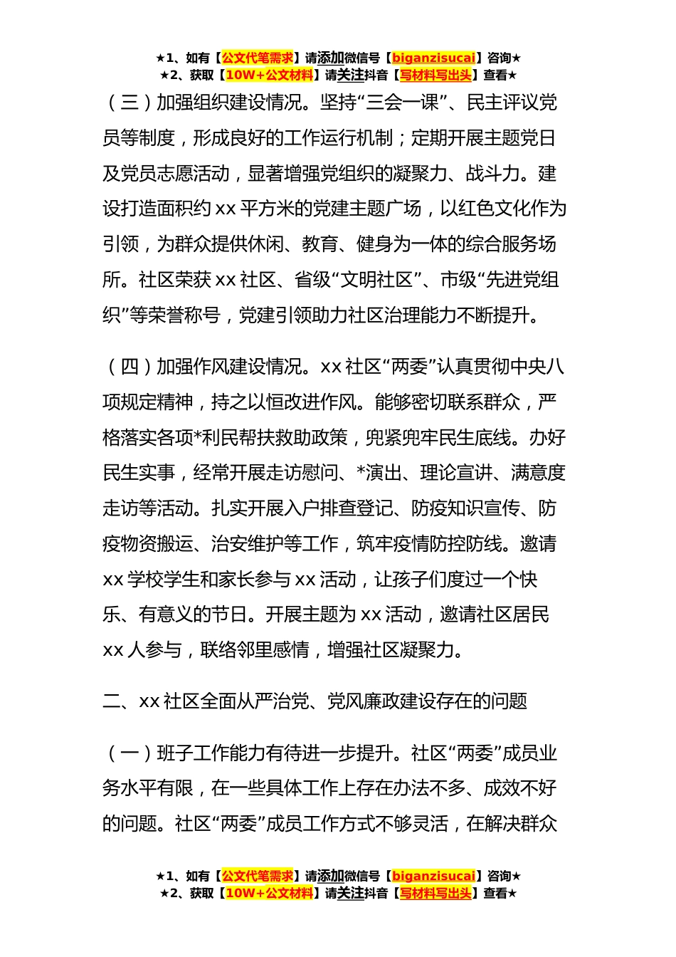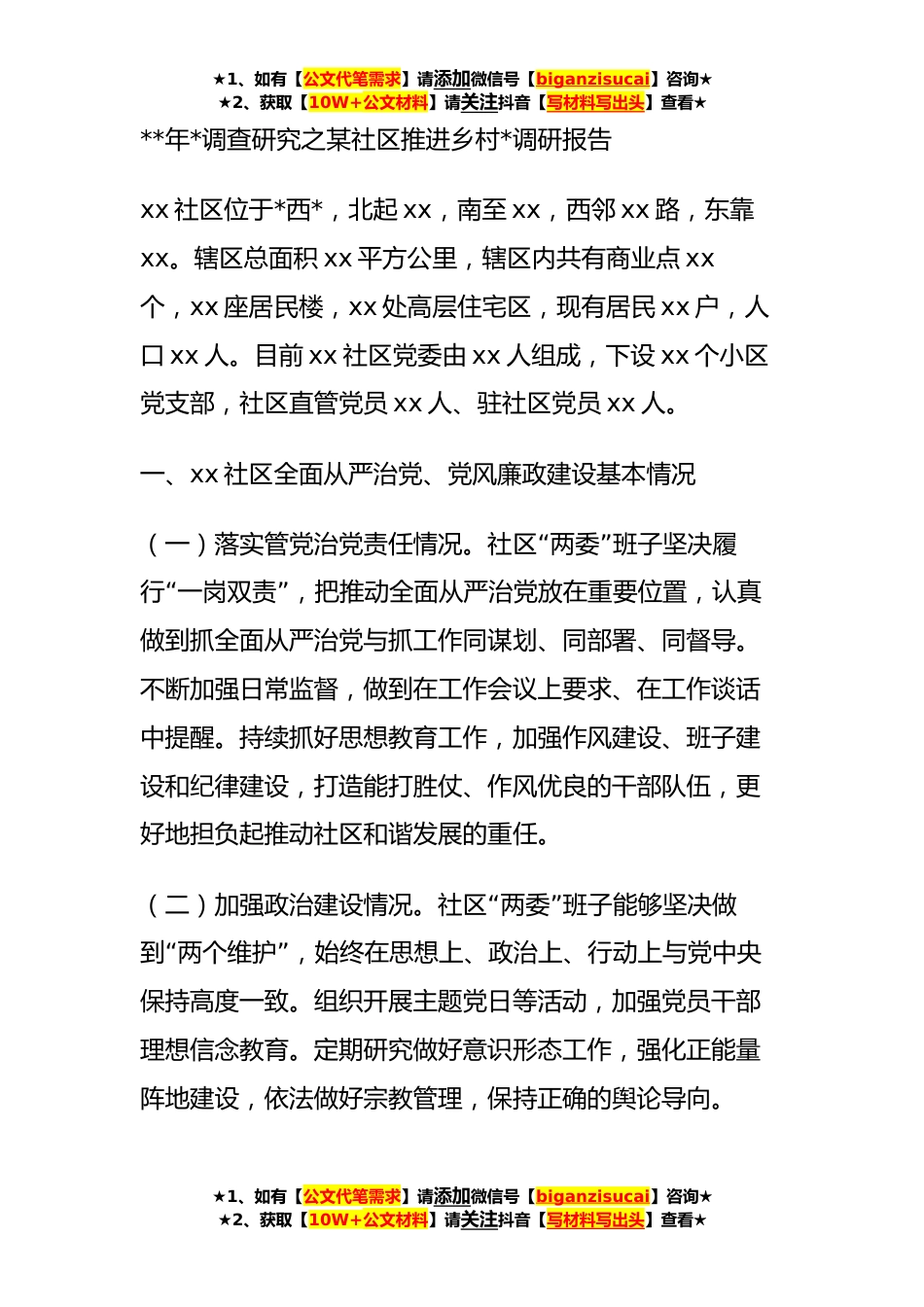★1、如有【公文代笔需求】请添加微信号【biganzisucai】咨询★★2、获取【10W+公文材料】请关注抖音【写材料写出头】查看★**年*调查研究之某社区推进乡村*调研报告xx社区位于*西*,北起xx,南至xx,西邻xx路,东靠xx。辖区总面积xx平方公里,辖区内共有商业点xx个,xx座居民楼,xx处高层住宅区,现有居民xx户,人口xx人。目前xx社区党委由xx人组成,下设xx个小区党支部,社区直管党员xx人、驻社区党员xx人。一、xx社区全面从严治党、党风廉政建设基本情况“”(一)落实管党治党责任情况。社区两委班子坚决履“”行一岗双责,把推动全面从严治党放在重要位置,认真做到抓全面从严治党与抓工作同谋划、同部署、同督导。不断加强日常监督,做到在工作会议上要求、在工作谈话中提醒。持续抓好思想教育工作,加强作...