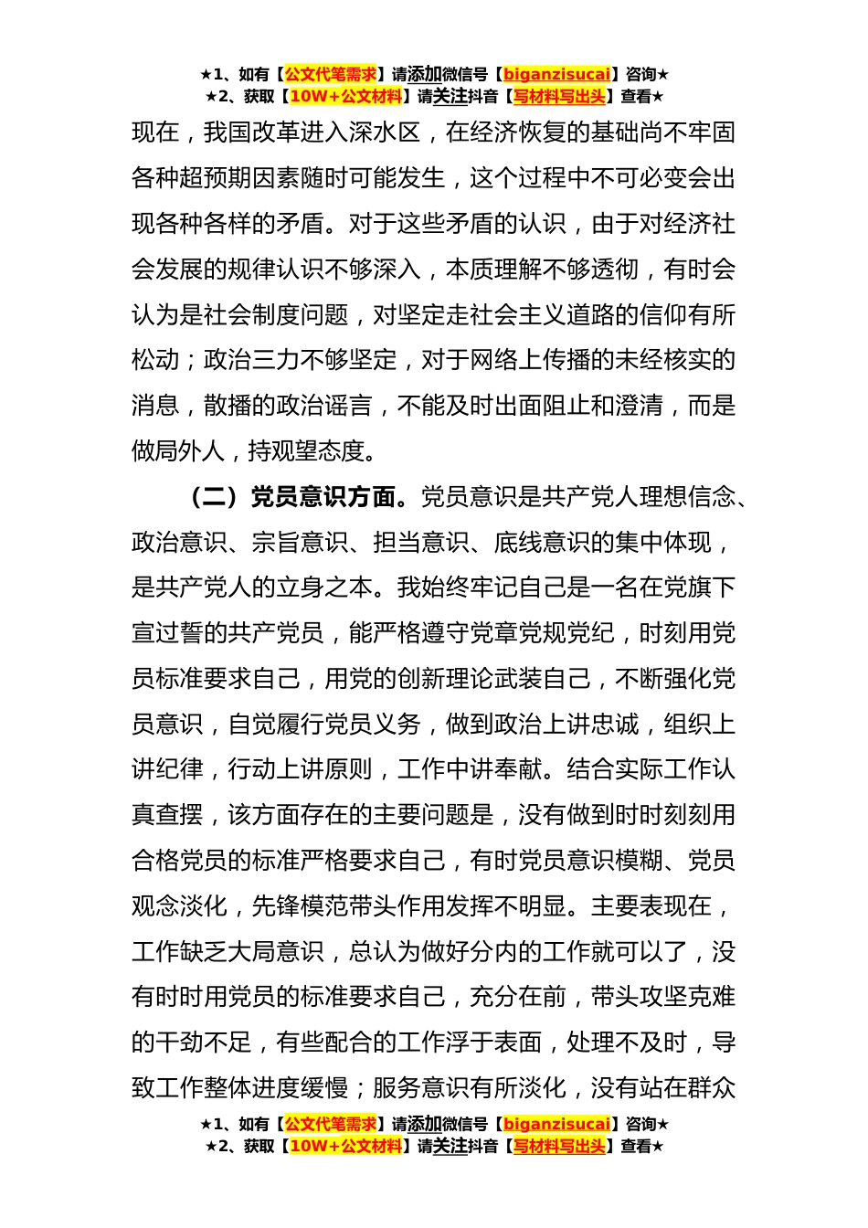 ★1、如有【公文代笔需求】请添加微信号【biganzisucai】咨询★★2、获取【10W+公文材料】请关注抖音【写材料写出头】查看★XX国有企业普通党员**年组织生活会个人对照检查发言提纲根据关于召开X属国有企业组织生活会相关安排,会前我坚持集中研讨和个人自学相结合,认真学习党的XX大报告和党章,习近平总书记在党的二十届一中、二中全会上的重要讲话精神,以及习近平总书记关于国企改革发展一系列重要指示批示认真精神,深入开展谈心谈话,广泛征询意见,对照党章查找自身差距和不足,现将检视情况汇报如下:一、围绕六个方面查摆自身存在的问题(一)政治信仰方面。政治信仰是政党安身立命之本,绝对忠诚是党员干部必备的素质。对党忠诚是一种政治信仰,这种信仰必须是绝对的、纯粹的、发自于内心的、不含任何杂...