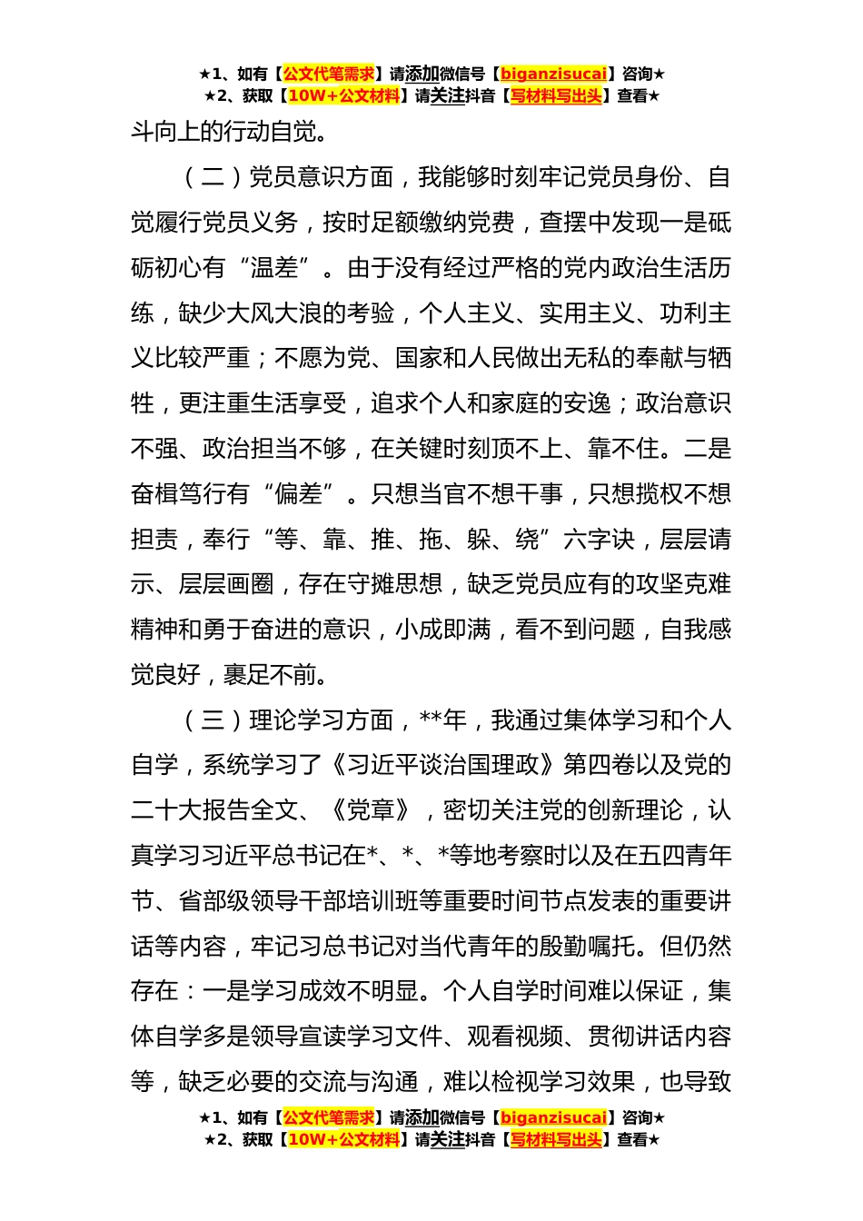★1、如有【公文代笔需求】请添加微信号【biganzisucai】咨询★★2、获取【10W+公文材料】请关注抖音【写材料写出头】查看★**年党员干部组织生活会六个方面对照检查材料(**)根据支部工作安排,本人认真围绕组织生活会主题,认真领会党委《关于召开**年度党支部组织生活会和开展民主评议党员工作的通知》的文件精神,综合运用《党的二十大报告学习辅导百问》《二十大党章修正案学习问答》等辅导材料深入学习党的二十大报告和党章,加强会前理论学习、打牢思想基础。认真对照政治信仰、党员意识、理论学习等六个方面,深刻查找自身突出问题,剖析原因,并提出整改措施。下面,按照“六个方面”要求,对照检查情况汇报如下。一、对照六个方面查摆的问题(一)政治信仰方面,一是信仰的理论基石不够稳固。虽然我能...