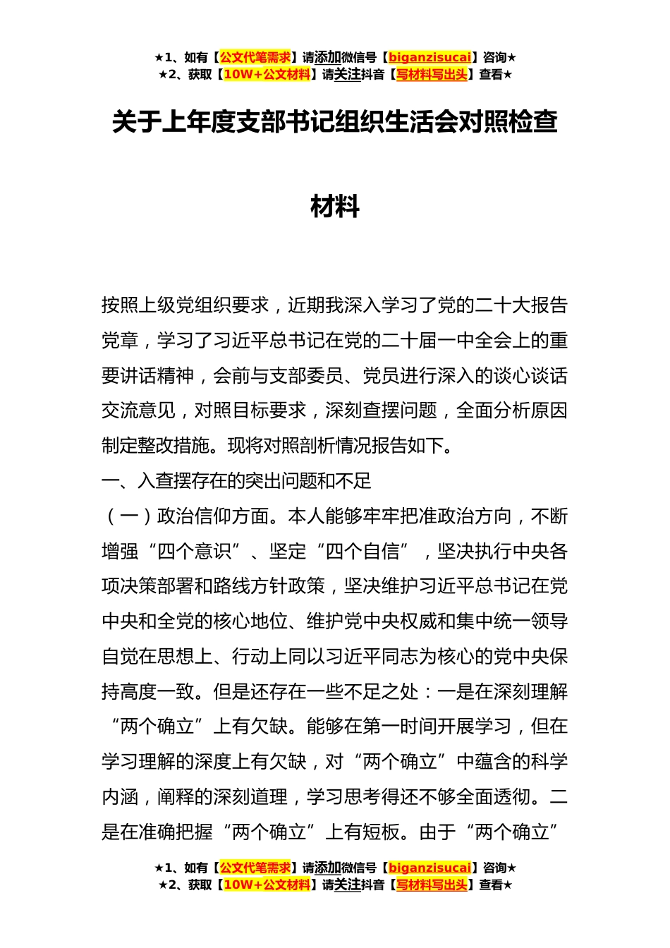 ★1、如有【公文代笔需求】请添加微信号【biganzisucai】咨询★★2、获取【10W+公文材料】请关注抖音【写材料写出头】查看★关于上年度支部书记组织生活会对照检查材料按照上级党组织要求,近期我深入学习了党的二十大报告党章,学习了习近平总书记在党的二十届一中全会上的重要讲话精神,会前与支部委员、党员进行深入的谈心谈话交流意见,对照目标要求,深刻查摆问题,全面分析原因制定整改措施。现将对照剖析情况报告如下。一、入查摆存在的突出问题和不足(一)政治信仰方面。本人能够牢牢把准政治方向,不断增强“四个意识”、坚定“四个自信”,坚决执行中央各项决策部署和路线方针政策,坚决维护习近平总书记在党中央和全党的核心地位、维护党中央权威和集中统一领导自觉在思想上、行动上同以习近平同志为...