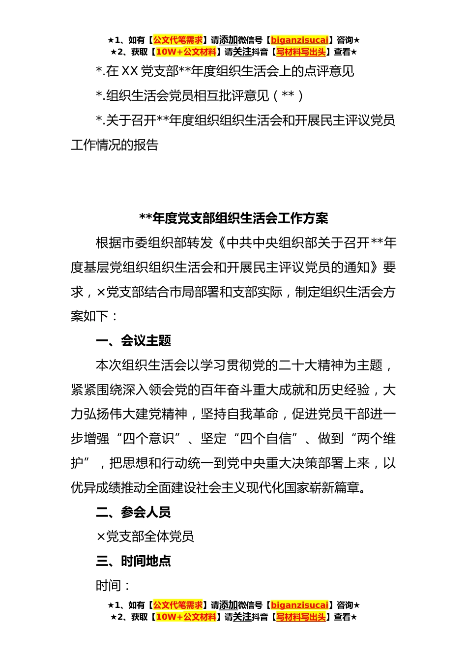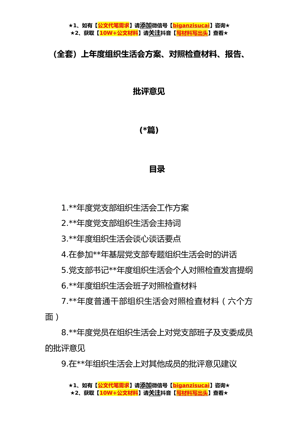 ★1、如有【公文代笔需求】请添加微信号【biganzisucai】咨询★★2、获取【10W+公文材料】请关注抖音【写材料写出头】查看★(全套)上年度组织生活会方案、对照检查材料、报告、批评意见(*篇)目录1.**年度党支部组织生活会工作方案2.**年度党支部组织生活会主持词3.**年度组织生活会谈心谈话要点4.在参加**年基层党支部专题组织生活会时的讲话5.党支部书记**年度组织生活会个人对照检查发言提纲6.**年度组织生活会班子对照检查材料7.**年度普通干部组织生活会对照检查材料(六个方面)8.**年度党员在组织生活会上对党支部班子及支委成员的批评意见9.在**年组织生活会上对其他成员的批评意见建议★1、如有【公文代笔需求】请添加微信号【biganzisucai】咨询★★2、获取【10W+公文材料】请关注抖音【写材料写出头】...