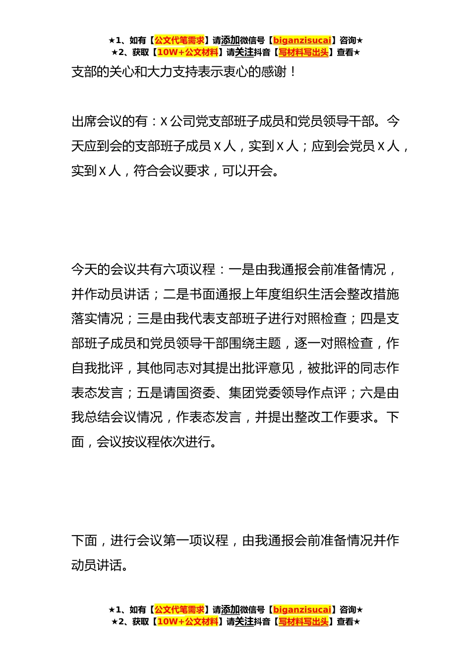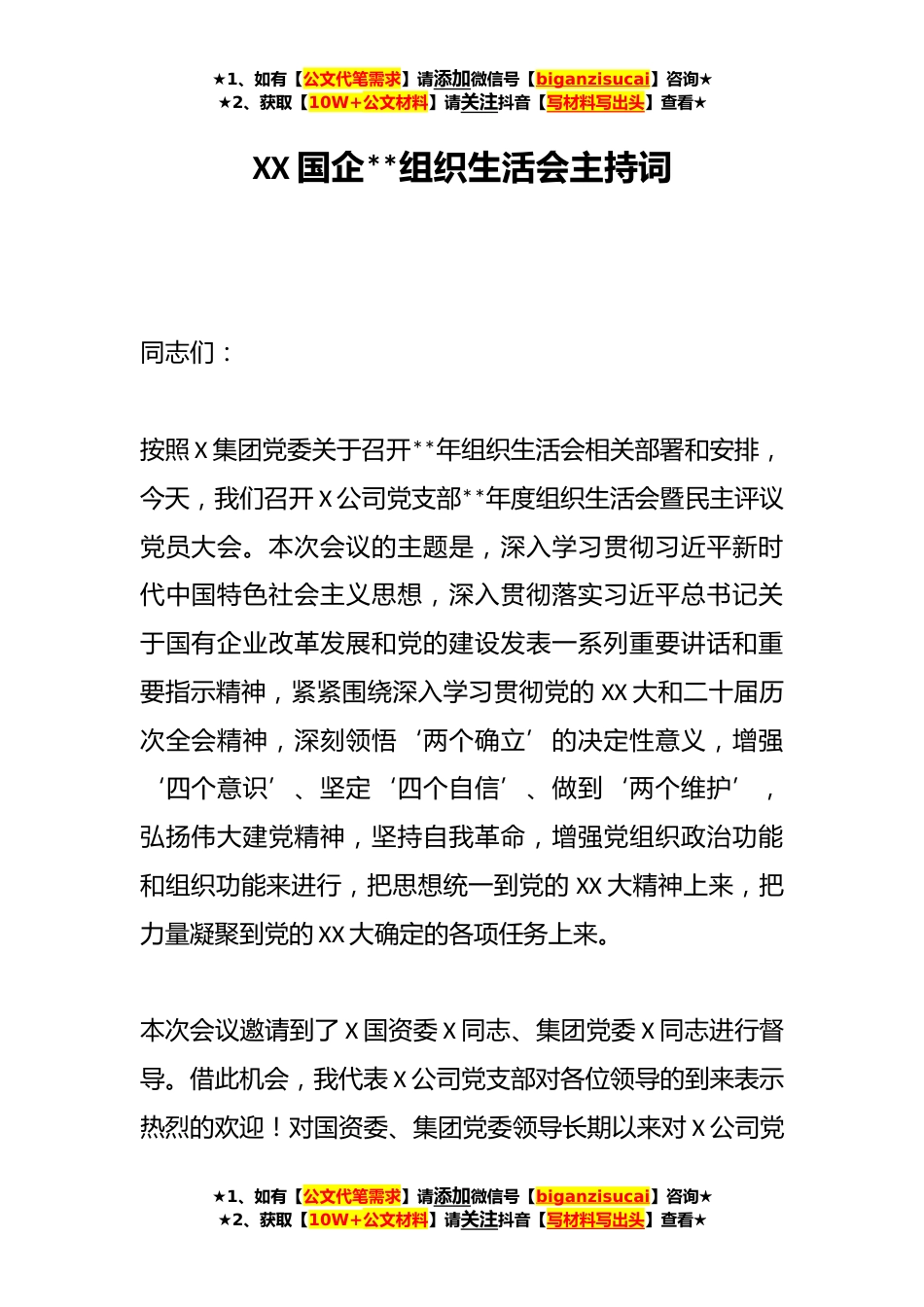 ★1、如有【公文代笔需求】请添加微信号【biganzisucai】咨询★★2、获取【10W+公文材料】请关注抖音【写材料写出头】查看★XX国企**组织生活会主持词同志们:按照X集团党委关于召开**年组织生活会相关部署和安排,今天,我们召开X公司党支部**年度组织生活会暨民主评议党员大会。本次会议的主题是,深入学习贯彻习近平新时代中国特色社会主义思想,深入贯彻落实习近平总书记关于国有企业改革发展和党的建设发表一系列重要讲话和重要指示精神,紧紧围绕深入学习贯彻党的XX大和二十届历次全会精神,深刻领悟‘两个确立’的决定性意义,增强‘四个意识’、坚定‘四个自信’、做到‘两个维护’,弘扬伟大建党精神,坚持自我革命,增强党组织政治功能和组织功能来进行,把思想统一到党的XX大精神上来,把力量凝聚到党...