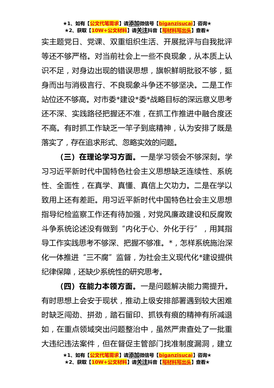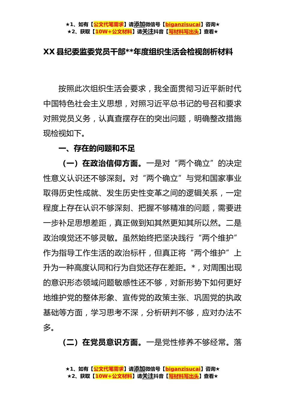 ★1、如有【公文代笔需求】请添加微信号【biganzisucai】咨询★★2、获取【10W+公文材料】请关注抖音【写材料写出头】查看★XX县纪委监委党员干部**年度组织生活会检视剖析材料按照此次组织生活会要求,我全面贯彻习近平新时代中国特色社会主义思想,对照习近平总书记的号召和要求对照党员义务,认真查摆存在的突出问题,明确整改措施现检视如下。一、存在的问题和不足(一)在政治信仰方面。一是对“两个确立”的决定性意义认识还不够深刻。对“两个确立”与党和国家事业取得历史性成就、发生历史性变革之间的逻辑关系,一定程度上存在认识不够深刻、把握不够精准的问题,需要进一步补足思想差距,真正做到知其然更知其所以然。二是政治嗅觉还不够灵敏。虽然始终把坚决践行“两个维护”作为指导工作生活的政治标...