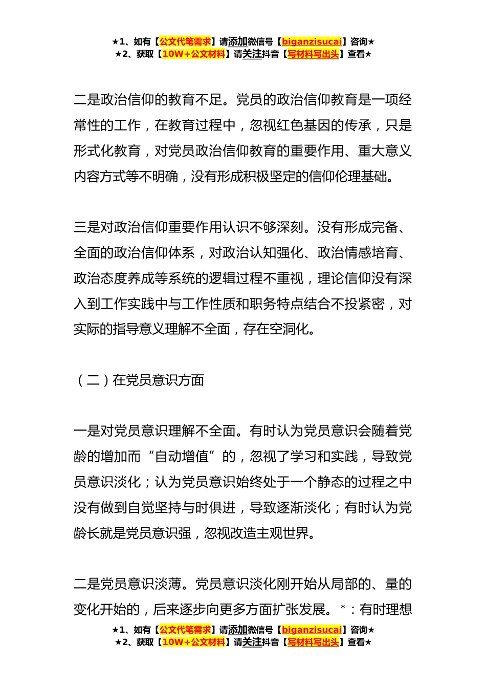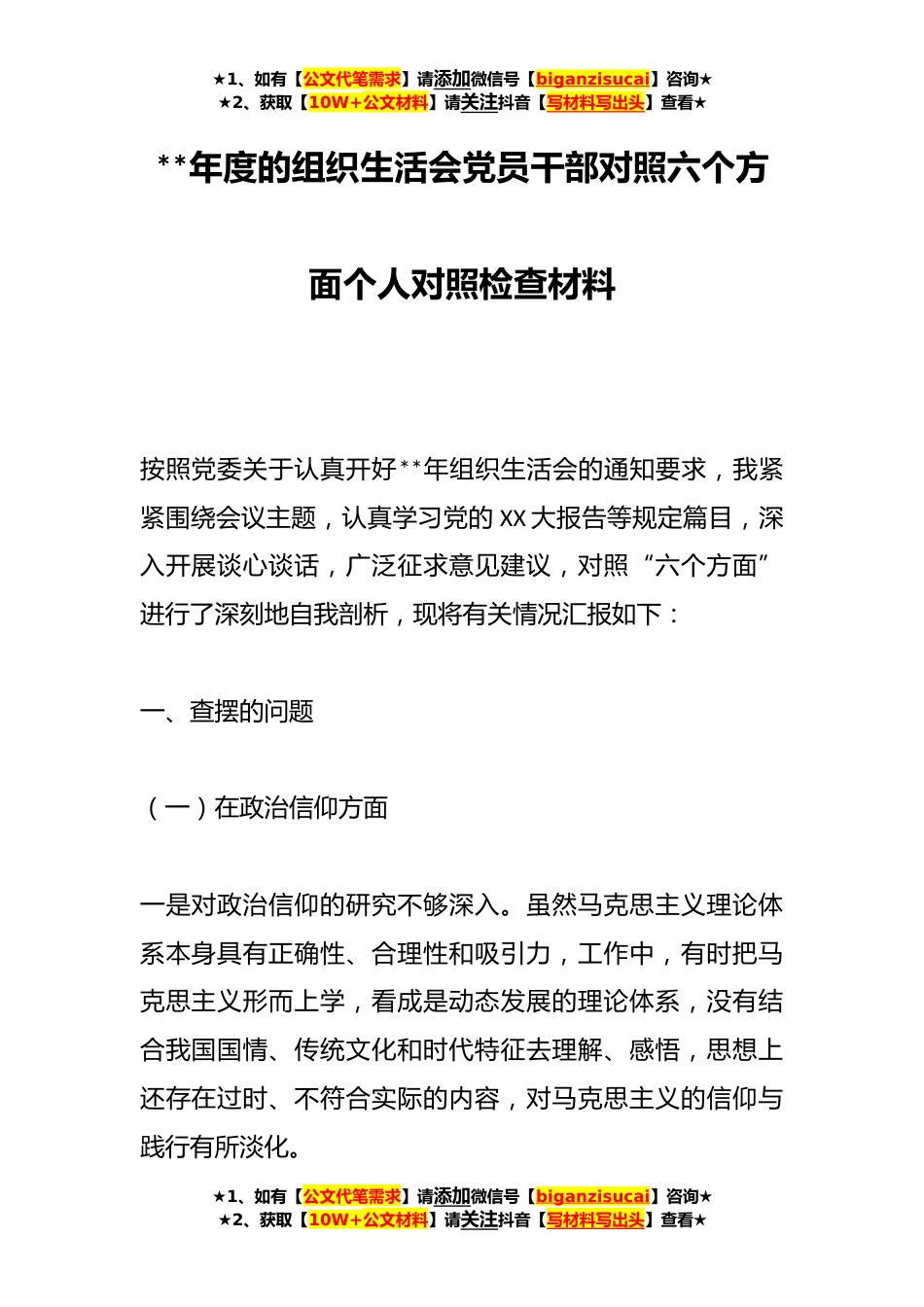 ★1、如有【公文代笔需求】请添加微信号【biganzisucai】咨询★★2、获取【10W+公文材料】请关注抖音【写材料写出头】查看★**年度的组织生活会党员干部对照六个方面个人对照检查材料按照党委关于认真开好**年组织生活会的通知要求,我紧紧围绕会议主题,认真学习党的XX大报告等规定篇目,深入开展谈心谈话,广泛征求意见建议,对照“六个方面”进行了深刻地自我剖析,现将有关情况汇报如下:一、查摆的问题(一)在政治信仰方面一是对政治信仰的研究不够深入。虽然马克思主义理论体系本身具有正确性、合理性和吸引力,工作中,有时把马克思主义形而上学,看成是动态发展的理论体系,没有结合我国国情、传统文化和时代特征去理解、感悟,思想上还存在过时、不符合实际的内容,对马克思主义的信仰与践行有所淡化。...
