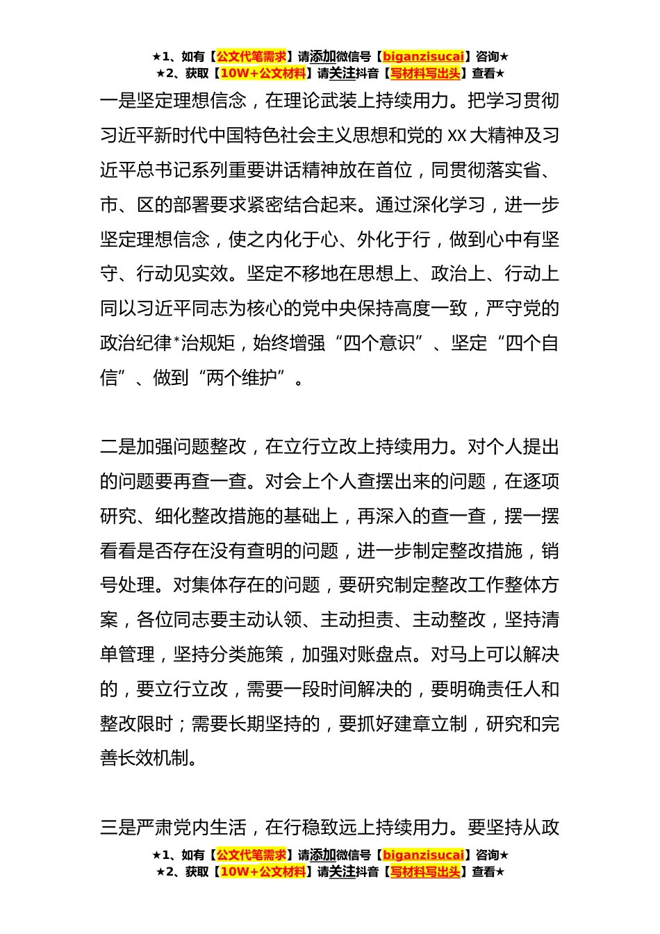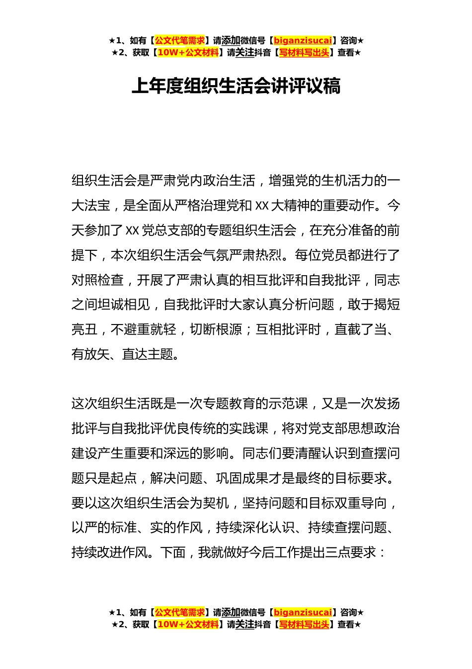 ★1、如有【公文代笔需求】请添加微信号【biganzisucai】咨询★★2、获取【10W+公文材料】请关注抖音【写材料写出头】查看★上年度组织生活会讲评议稿组织生活会是严肃党内政治生活,增强党的生机活力的一大法宝,是全面从严格治理党和XX大精神的重要动作。今天参加了XX党总支部的专题组织生活会,在充分准备的前提下,本次组织生活会气氛严肃热烈。每位党员都进行了对照检查,开展了严肃认真的相互批评和自我批评,同志之间坦诚相见,自我批评时大家认真分析问题,敢于揭短亮丑,不避重就轻,切断根源;互相批评时,直截了当、有放矢、直达主题。这次组织生活既是一次专题教育的示范课,又是一次发扬批评与自我批评优良传统的实践课,将对党支部思想政治建设产生重要和深远的影响。同志们要清醒认识到查摆问题只...