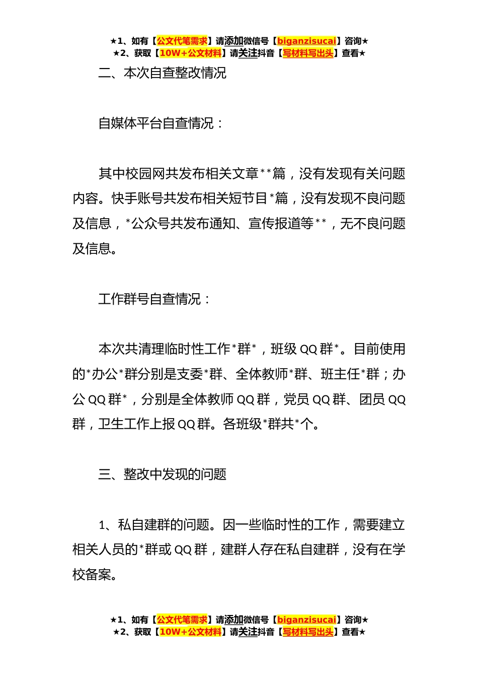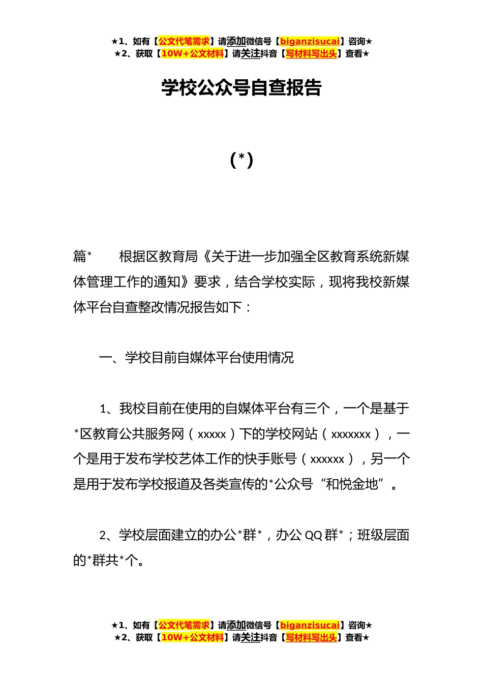 ★1、如有【公文代笔需求】请添加微信号【biganzisucai】咨询★★2、获取【10W+公文材料】请关注抖音【写材料写出头】查看★学校公众号自查报告(*)篇*根据区教育局《关于进一步加强全区教育系统新媒体管理工作的通知》要求,结合学校实际,现将我校新媒体平台自查整改情况报告如下:一、学校目前自媒体平台使用情况1、我校目前在使用的自媒体平台有三个,一个是基于*区教育公共服务网(xxxxx)下的学校网站(xxxxxxx),一个是用于发布学校艺体工作的快手账号(xxxxxx),另一个是用于发布学校报道及各类宣传的*公众号“和悦金地”。2、学校层面建立的办公*群*,办公QQ群*;班级层面的*群共*个。★1、如有【公文代笔需求】请添加微信号【biganzisucai】咨询★★2、获取【10W+公文材料】请关注抖音【写材料写出头...