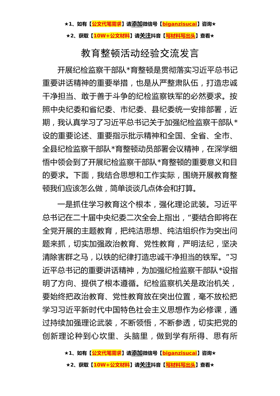 ★1、如有【公文代笔需求】请添加微信号【biganzisucai】咨询★★2、获取【10W+公文材料】请关注抖音【写材料写出头】查看★教育整顿活动经验交流发言开展纪检监察干部队*育整顿是贯彻落实习近平总书记重要讲话精神的重要举措,也是从严整肃队伍,打造忠诚干净担当、敢于善于斗争的纪检监察铁军的必然要求。按照中央纪委和省纪委、市纪委、县纪委统一安排部署,近期,我认真学习了习近平总书记关于加强纪检监察干部队*设的重要论述、重要指示批示精神和全国、全省、全市、全县纪检监察干部队*育整顿动员部署会议精神,在深学细悟中领会到了开展纪检监察干部队*育整顿的重要意义和目的要求。下面,我结合思想和工作实际,围绕开展教育整顿我们应该怎么做,简单谈谈几点体会和打算。一是抓住学习教育这个根本,强化...