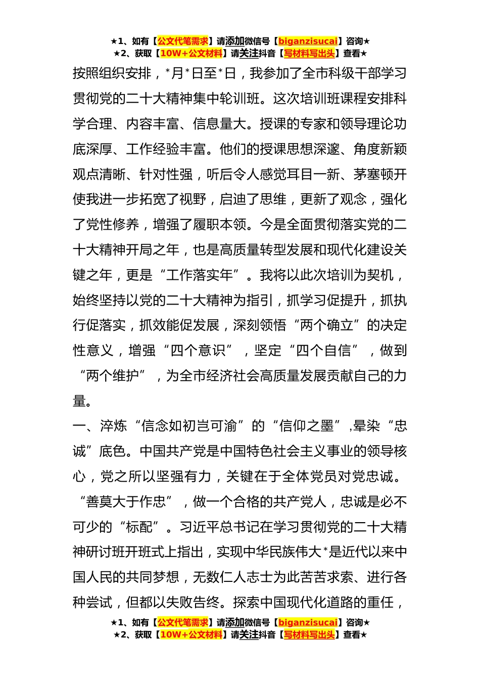 ★1、如有【公文代笔需求】请添加微信号【biganzisucai】咨询★★2、获取【10W+公文材料】请关注抖音【写材料写出头】查看★按照组织安排,*月*日至*日,我参加了全市科级干部学习贯彻党的二十大精神集中轮训班。这次培训班课程安排科学合理、内容丰富、信息量大。授课的专家和领导理论功底深厚、工作经验丰富。他们的授课思想深邃、角度新颖观点清晰、针对性强,听后令人感觉耳目一新、茅塞顿开使我进一步拓宽了视野,启迪了思维,更新了观念,强化了党性修养,增强了履职本领。今是全面贯彻落实党的二十大精神开局之年,也是高质量转型发展和现代化建设关键之年,更是“工作落实年”。我将以此次培训为契机,始终坚持以党的二十大精神为指引,抓学习促提升,抓执行促落实,抓效能促发展,深刻领悟“两个确立”的...