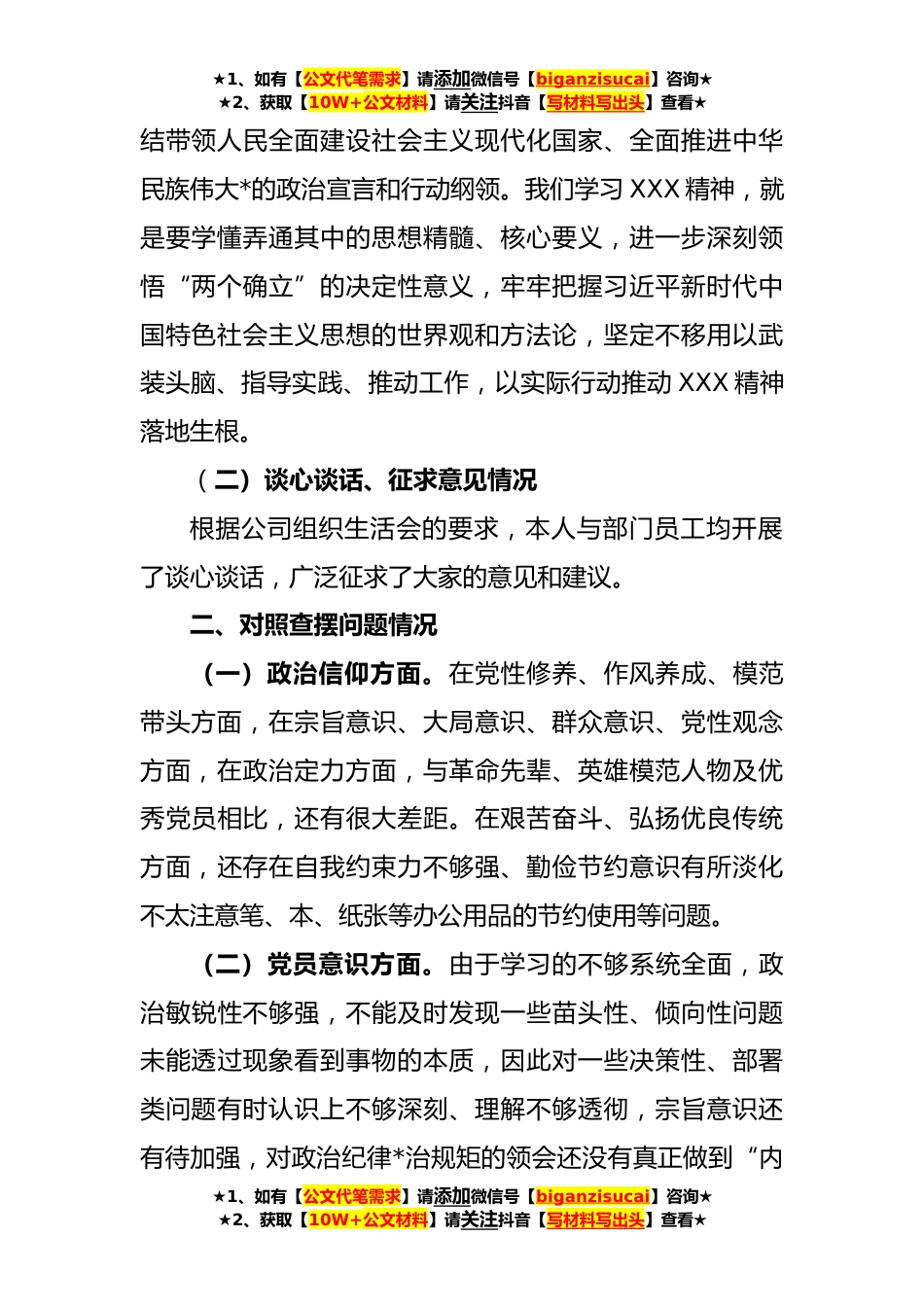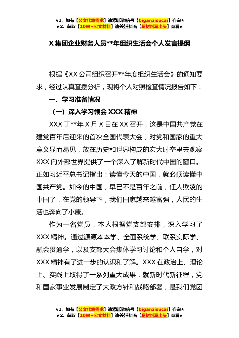 ★1、如有【公文代笔需求】请添加微信号【biganzisucai】咨询★★2、获取【10W+公文材料】请关注抖音【写材料写出头】查看★X集团企业财务人员**年组织生活会个人发言提纲根据《XX公司组织召开**年度组织生活会》的通知要求,经过认真查摆分析,现将个人对照检查情况报告如下:一、学习准备情况(一)深入学习领会XXX精神XXX于**年X月X日在XX召开,这是中国共产党在建党百年后迎来的首次全国代表大会,对党和国家的重大意义显而易见,放在历史和世界构成的宏大时空里去观察XXX向外部世界提供了一个深入了解新时代中国的窗口。正如习近平总书记指出:读懂今天的中国,就必须读懂中国共产党。如今的中国,早已不是百年之前,任人欺凌的中国了,在党的领导下,我们国家越来越富强,人民的生活也奔向了小康。作为一名...
