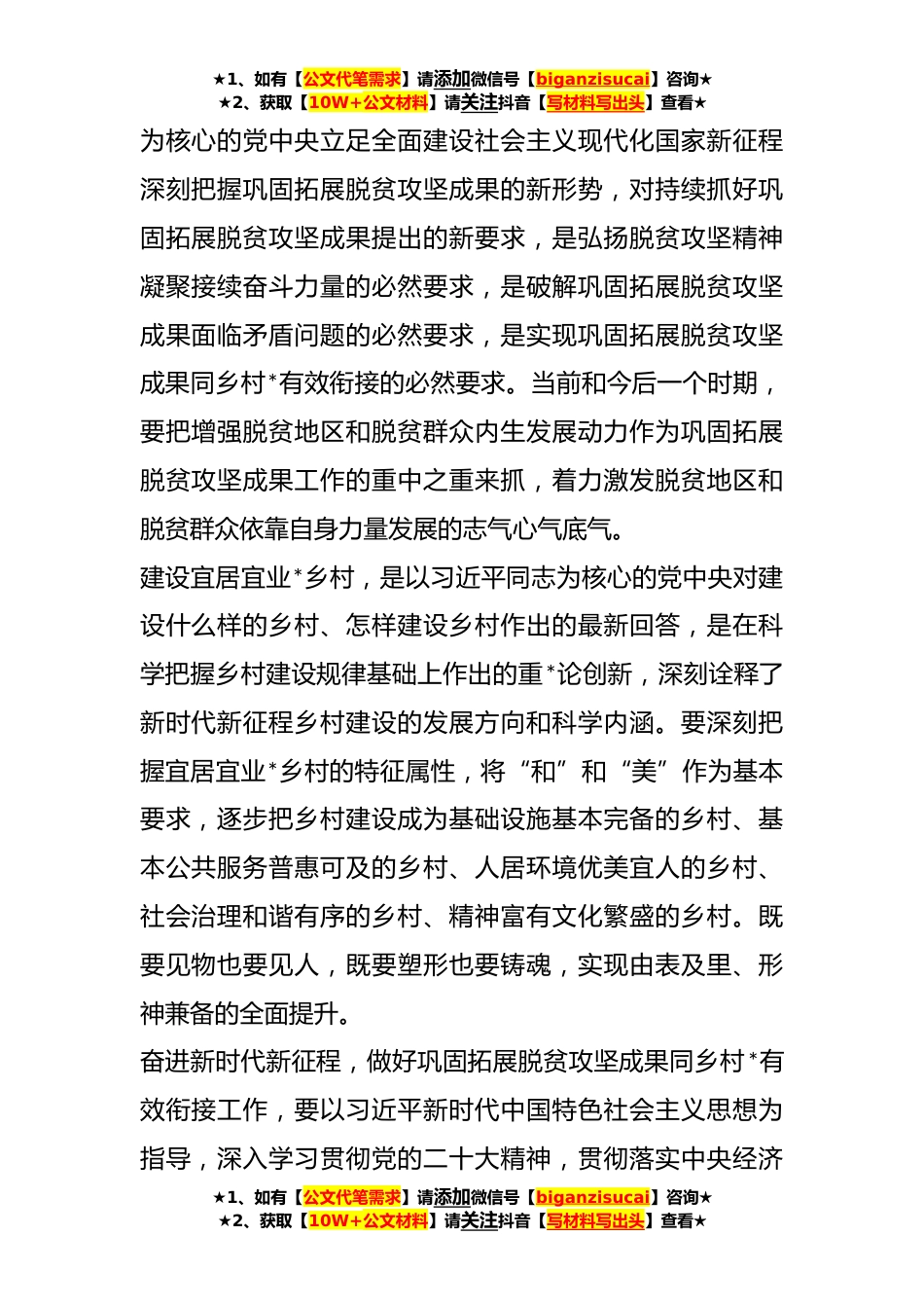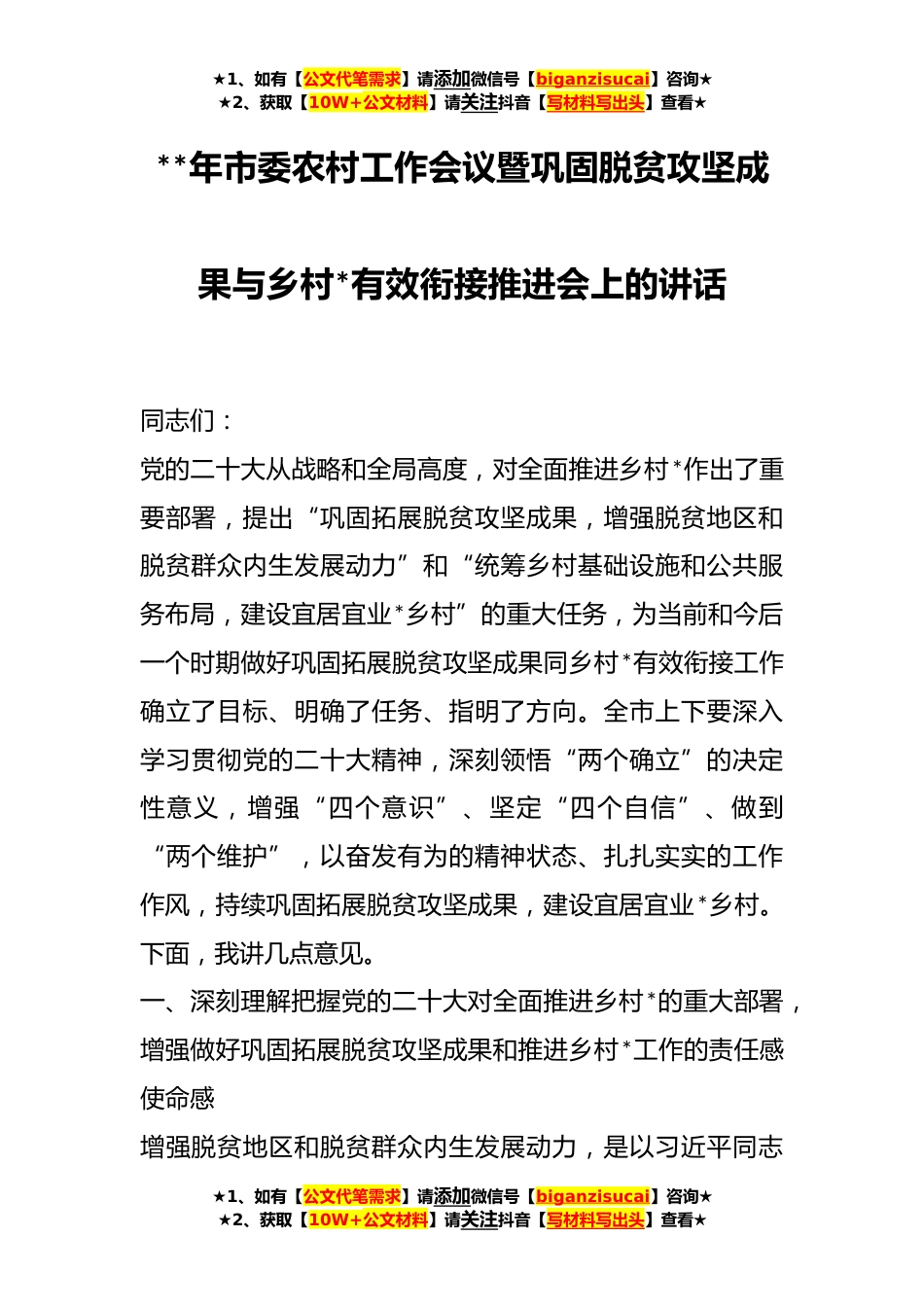 ★1、如有【公文代笔需求】请添加微信号【biganzisucai】咨询★★2、获取【10W+公文材料】请关注抖音【写材料写出头】查看★**年市委农村工作会议暨巩固脱贫攻坚成果与乡村*有效衔接推进会上的讲话同志们:党的二十大从战略和全局高度,对全面推进乡村*作出了重要部署,提出“巩固拓展脱贫攻坚成果,增强脱贫地区和脱贫群众内生发展动力”和“统筹乡村基础设施和公共服务布局,建设宜居宜业*乡村”的重大任务,为当前和今后一个时期做好巩固拓展脱贫攻坚成果同乡村*有效衔接工作确立了目标、明确了任务、指明了方向。全市上下要深入学习贯彻党的二十大精神,深刻领悟“两个确立”的决定性意义,增强“四个意识”、坚定“四个自信”、做到“两个维护”,以奋发有为的精神状态、扎扎实实的工作作风,持续巩固拓展脱...