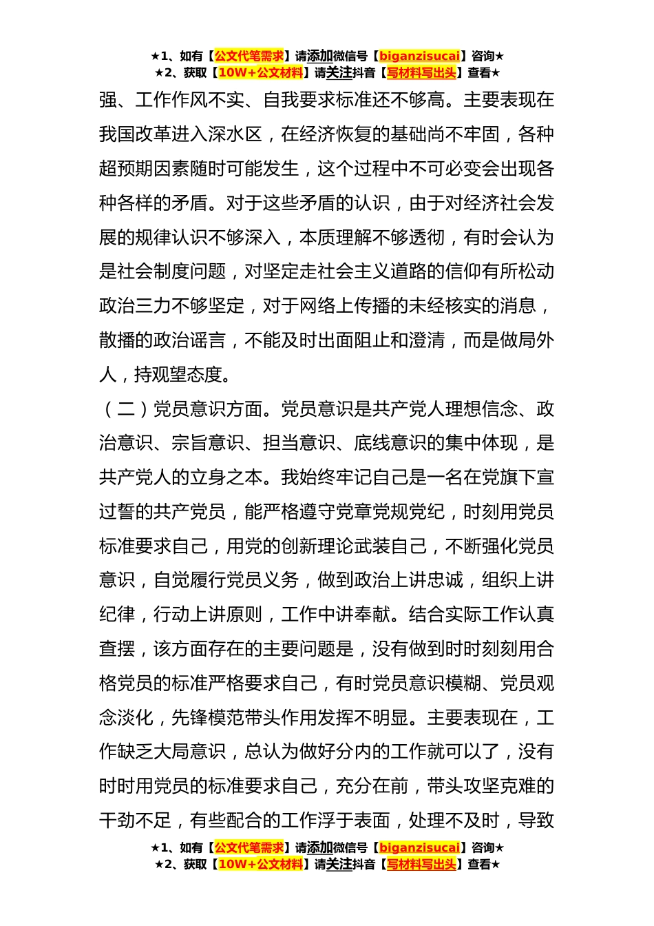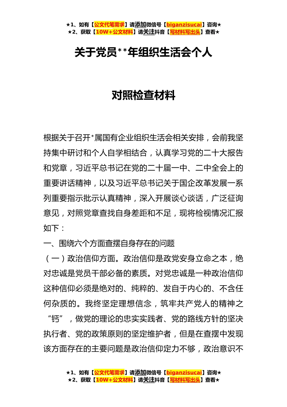 ★1、如有【公文代笔需求】请添加微信号【biganzisucai】咨询★★2、获取【10W+公文材料】请关注抖音【写材料写出头】查看★关于党员**年组织生活会个人对照检查材料根据关于召开*属国有企业组织生活会相关安排,会前我坚持集中研讨和个人自学相结合,认真学习党的二十大报告和党章,习近平总书记在党的二十届一中、二中全会上的重要讲话精神,以及习近平总书记关于国企改革发展一系列重要指示批示认真精神,深入开展谈心谈话,广泛征询意见,对照党章查找自身差距和不足,现将检视情况汇报如下:一、围绕六个方面查摆自身存在的问题(一)政治信仰方面。政治信仰是政党安身立命之本,绝对忠诚是党员干部必备的素质。对党忠诚是一种政治信仰这种信仰必须是绝对的、纯粹的、发自于内心的、不含任何杂质的。我终坚定...